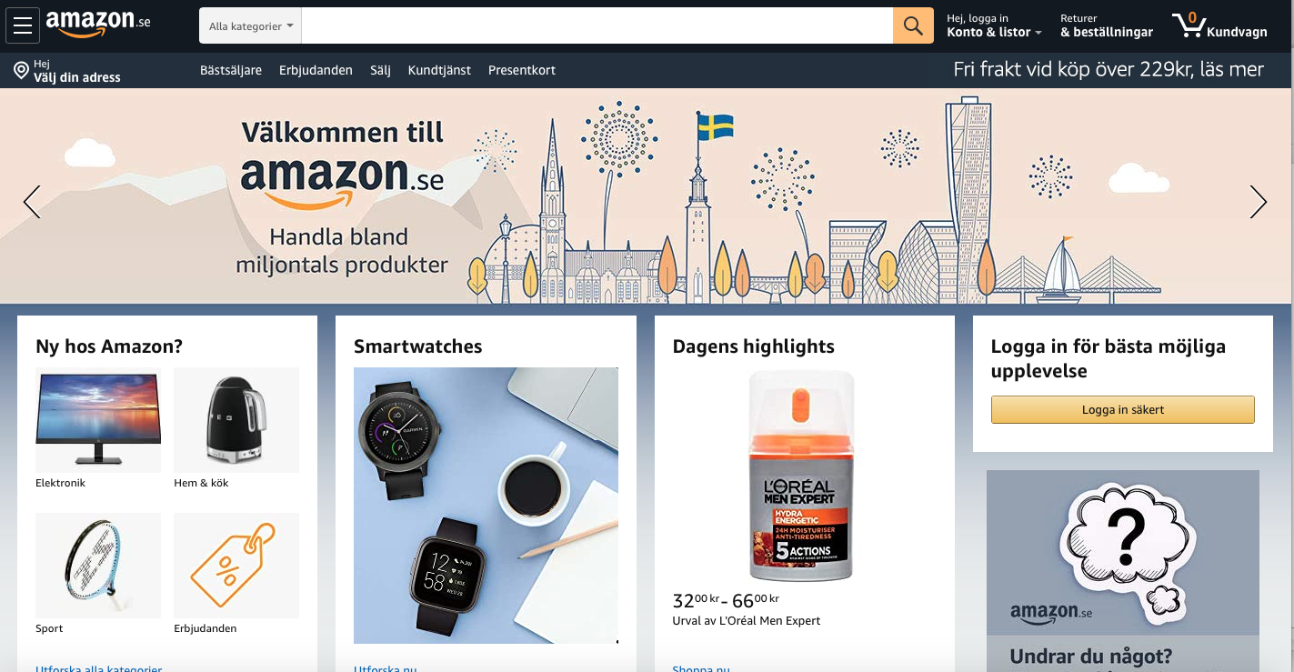Amazon kan desuden friste med gratis forsendelse, hvis man handler for mindst 229 svenske kroner (ca. 165 danske). Forsendelse håndteres af PostNord, og de fleste varer kan returneres gratis inden for 30 dage.