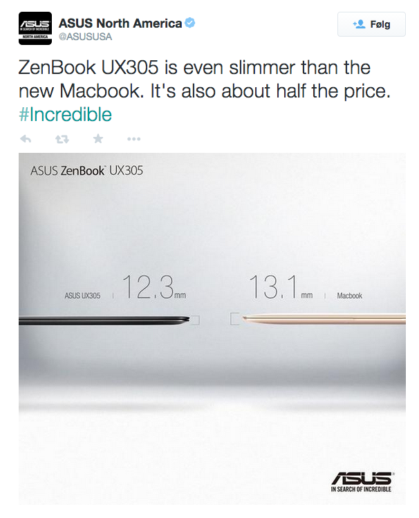 13,1 mm? Ha, ha, ha, siger ASUS på Twitter, og gør opmærksom på, at deres nye Zenbook UX305 (som vi øvrigt går i gang med at teste i næste uge) kun er 12,3 mm tynd!