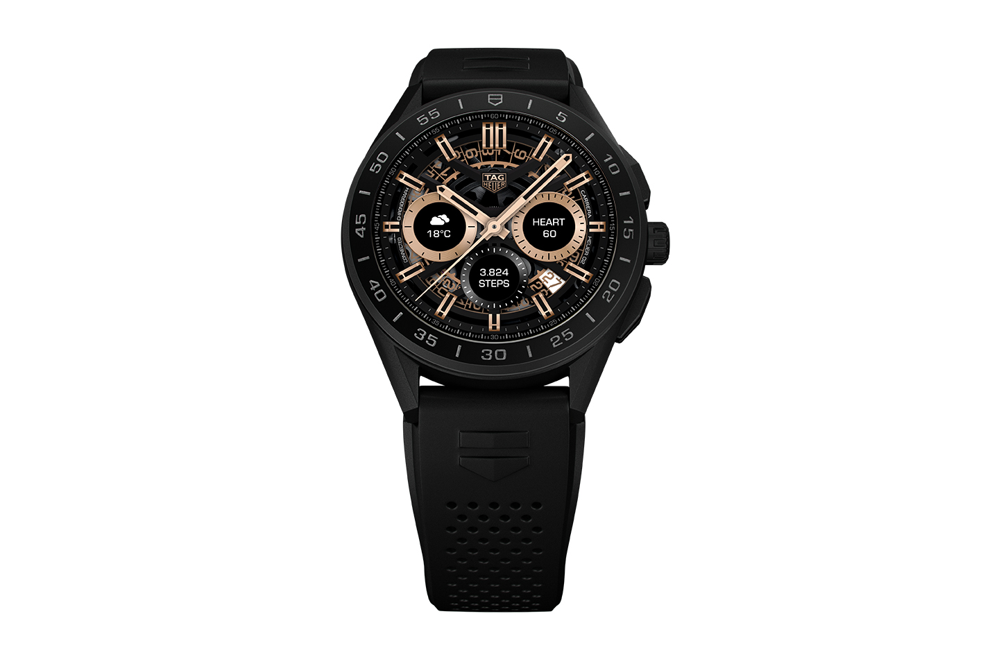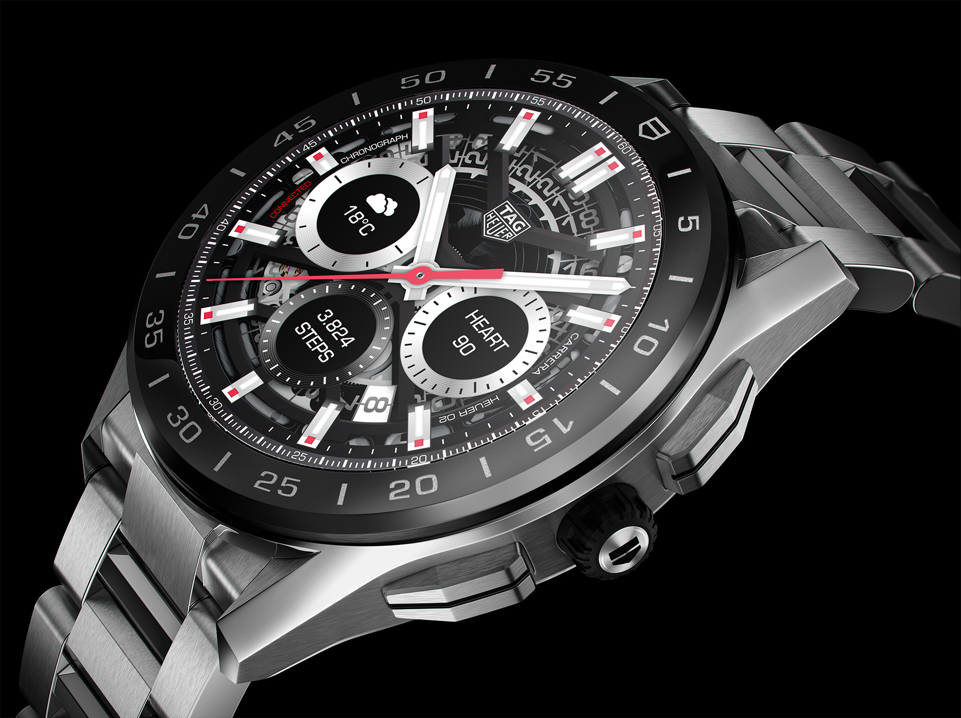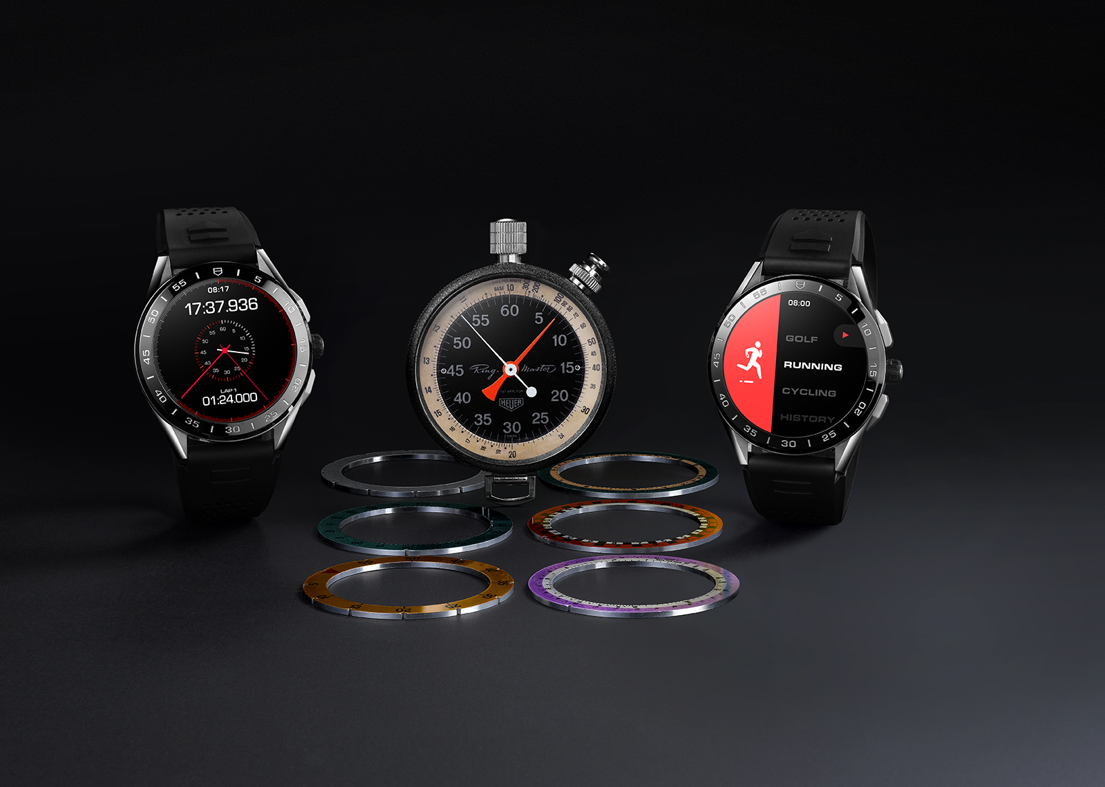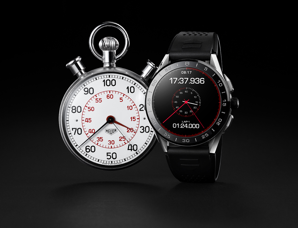 Her har de anstrengt sig ekstra for at få uret til at ligne en klassisk TAG Heuer-kronograf med kroner på siden, og man kan ændre udseende og funktionalitet, afhængigt af hvad man skal bruge det til. F.eks. kan man vælge imellem flere af TAG Heuers klassiske urskiver, såsom Carrera-kronografen eller det klassiske Heuer-stopur, som ses på billedet herunder. Det er også muligt selv at vælge, hvad der skal vises på skærmen.