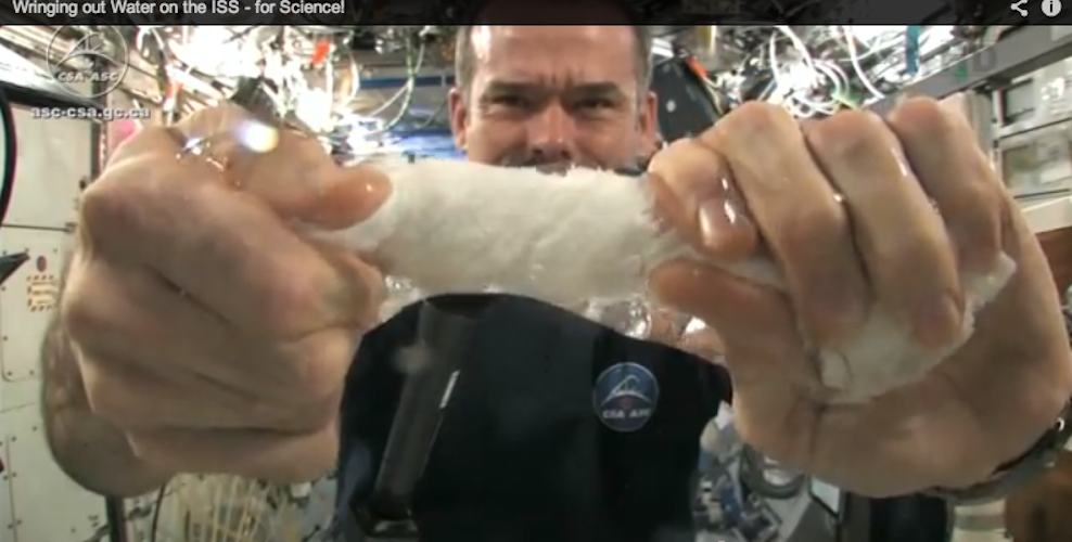 Præcis hvordan sådan en vaskeklud opfører sig i vægtløs tilstand ved vi nu, fordi to gymnasieelever fra Nova Scotia i Canada, Kendra Lemke og Meredith Faulkner, sendte et videospørgsmål til den canadiske astronaut på den internationale rumstation, Chris Hadfield, som en del af et eksperiment i skolens fysiktimer. Og svaret er både overraskende og fascinerende.