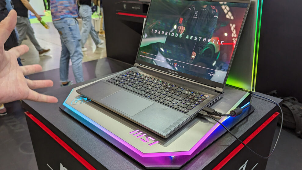 MSI havde også medbragt en ny generation af Titan-laptoppen, der er deres “alting fra øverste hylde”-model. selvfølgelig med i9-processor, Nvidia RTX 4090-grafik og mekanisk tastatur. I den støjende messehal kunne vi ikke høre de fire blæsere til køling af titanen.