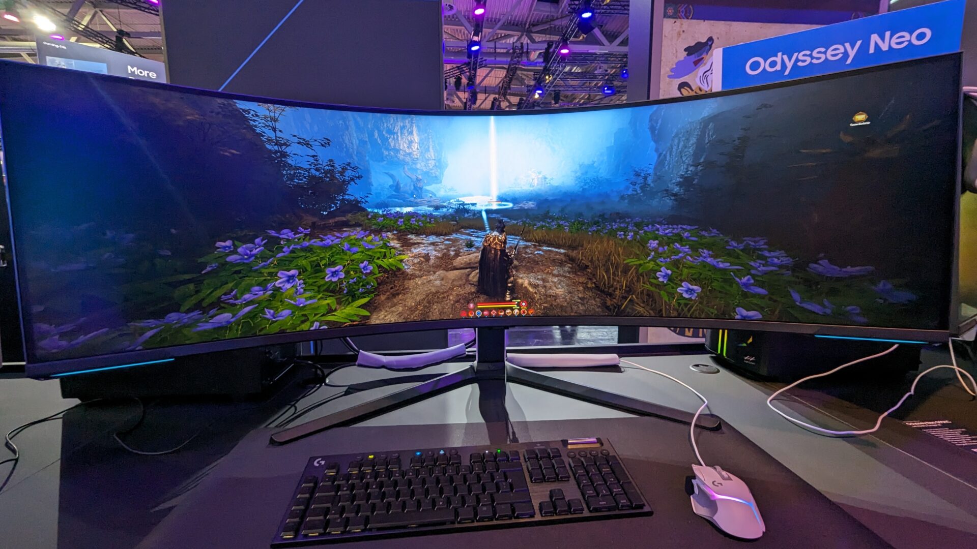 På Gamescom 2023 kan man også se den lige så overvældende Odyssey Ark. Skærmen er ganske vist ”kun” 55 tommer i diagonalmål. Men da den er i normalt 16:9-aspektforhold, er skærmarealet på den krumme skærm enormt.