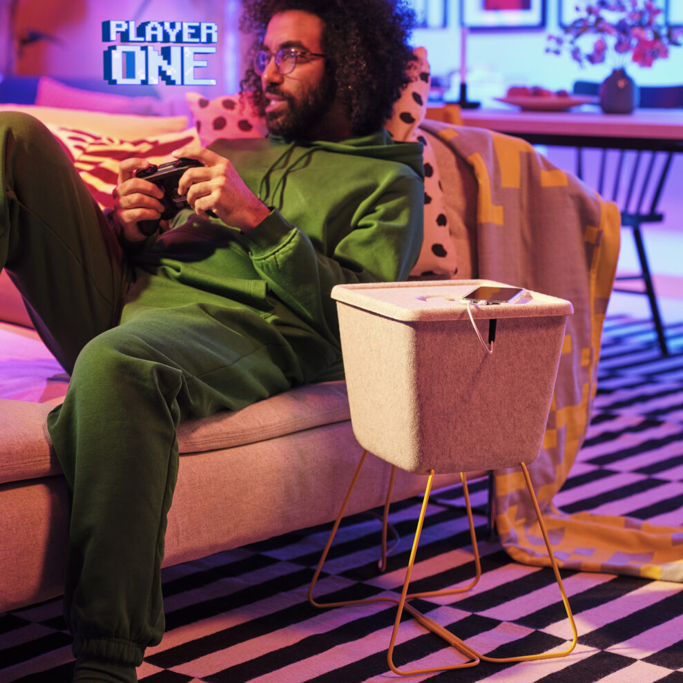 Fokus er på komfortable siddepladser, herunder ergonomiske stole og en oppustelig stol, der bryder med traditionelle gamingmøbler. Desuden indeholder kollektionen en gamingstation, der med sin foldbare bordplade og diskrete opbevaringsmuligheder, nemt transformerer spilarealet til et møbel, når spillet er slut.