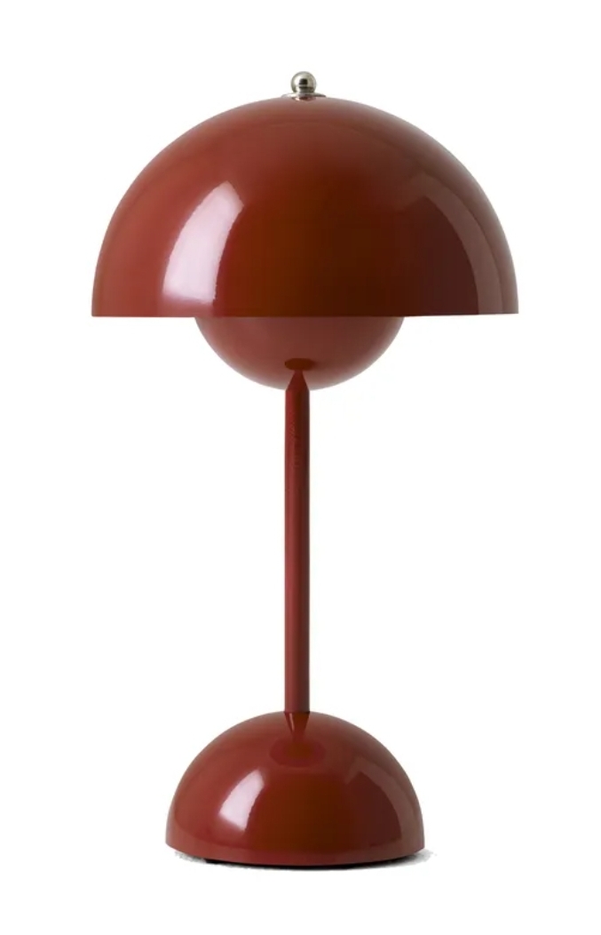 Denne bærbare bordlampe er en innovativ variation af Verner Pantons populære VP3. Den fås – ud over kærlighedens varme røde – i en række forskellige farver og oplades via USB-C-kabel. Det gør den perfekt til at flytte rundt mellem indendørs og udendørs for at skabe en intim stemning, uanset hvor I opholder jer. Lampen kan dæmpes i tre trin, og batterilevetiden er ti timer ved 100 procent lysstyrke.