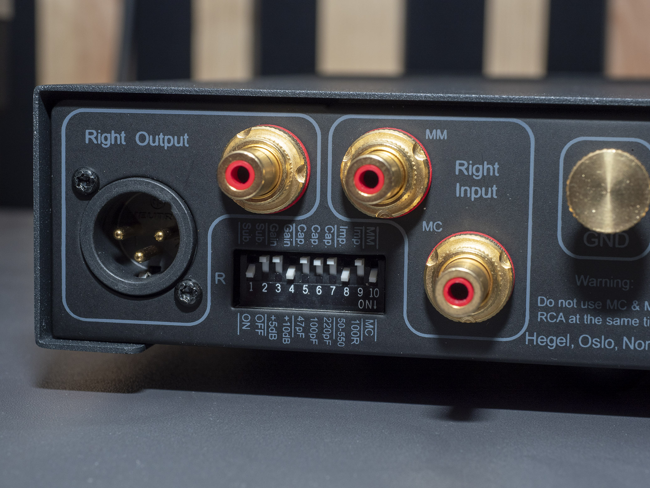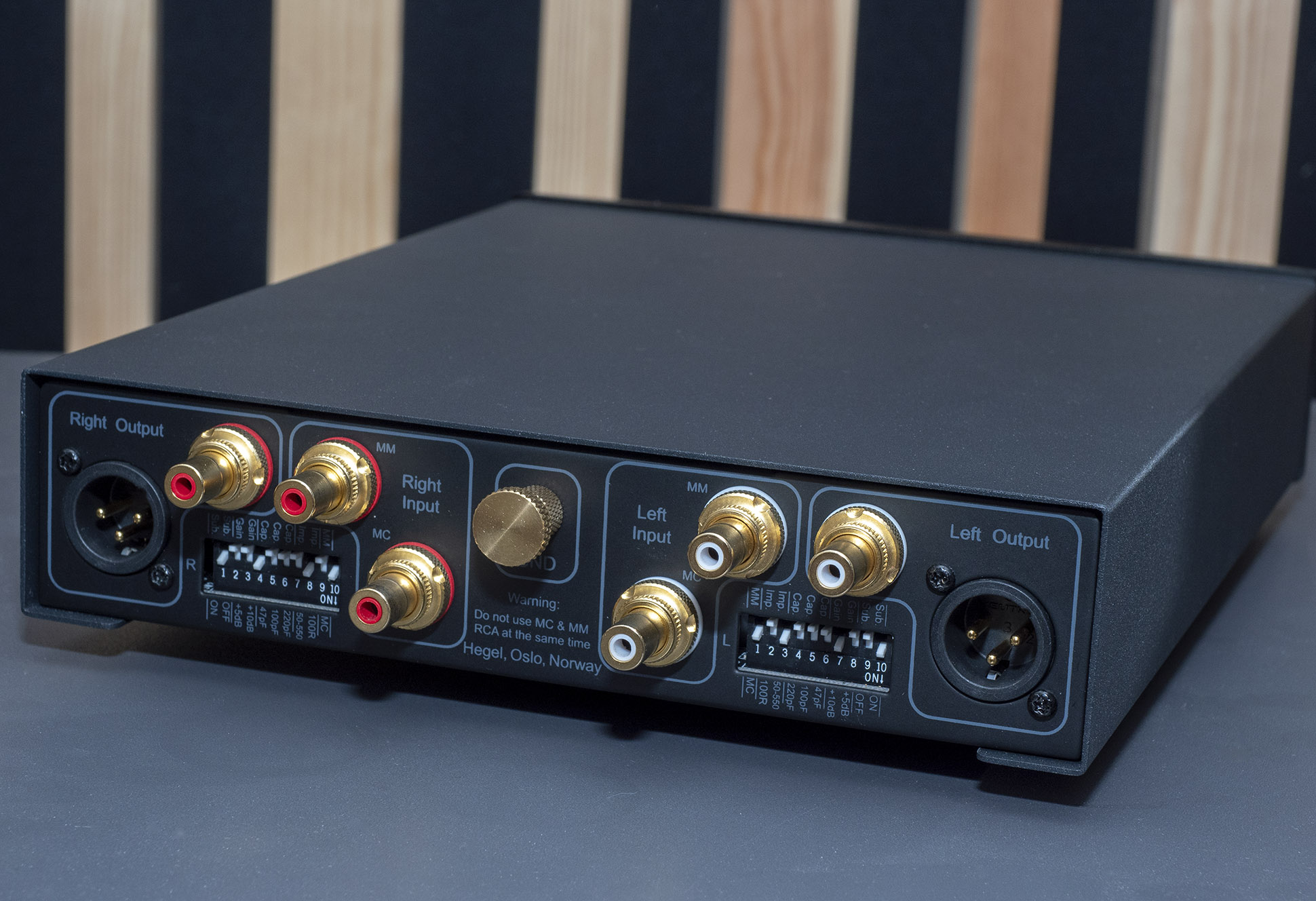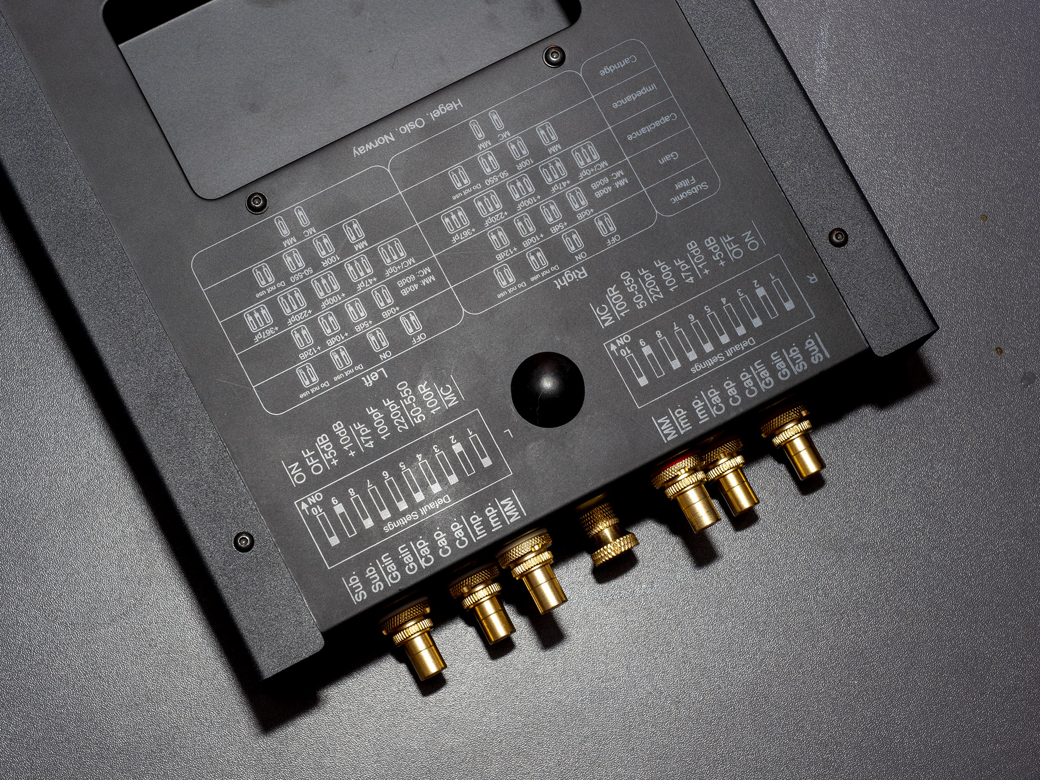 På bagsiden er der små dip-switches, som bruges til at indstille gain, kapacitans og belastningsmodstand for den tilsluttede pickup, og på undersiden har Hegel printet et skema, der viser, hvordan de skal sættes for at få den korrekte tilpasning til pickuppen.