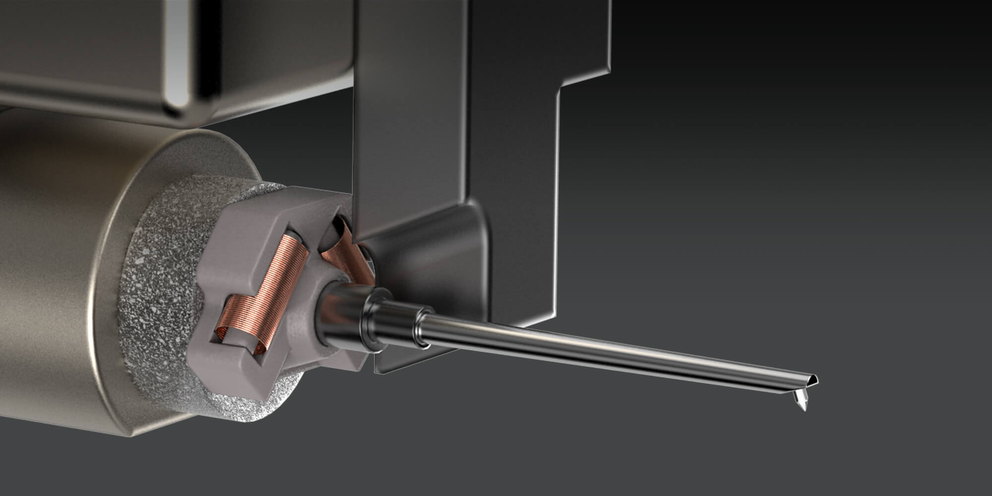 AT33x-serien har et nyt ophæng til nålearmen, som skal være mere fleksibelt og passe til flere tonearme. Spolerne kan ses på illustrationen ovenfor, og ophængets dæmpning er også tydelig her. Magneterne er små og kraftige neodymmagneter, og spolerne er viklet i rent PCOCC-kobber.