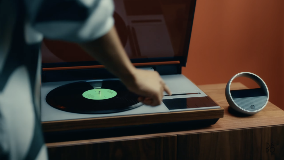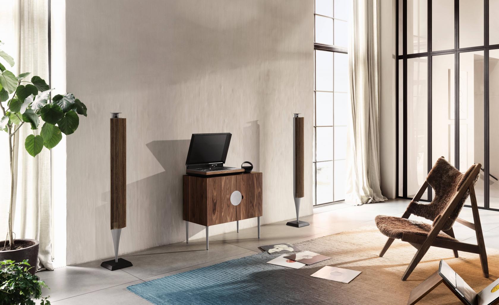 Pladespilleren er hjertet i anlægget, som også består af et par aktive, trådløse Beolab 18-højttalere, en Beoremote Halo fjernbetjening og et håndlavet møbel med plads til vinylplader.