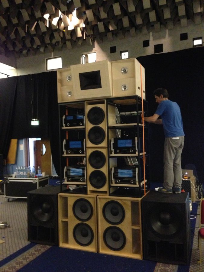 Systemet består af syv meterhøje tårne. Den samlede forstærkereffekt for de syv kanaler er 50.000 watt. Halvtreds kilowatt. Pumpet ind i højeffektive højttalere.