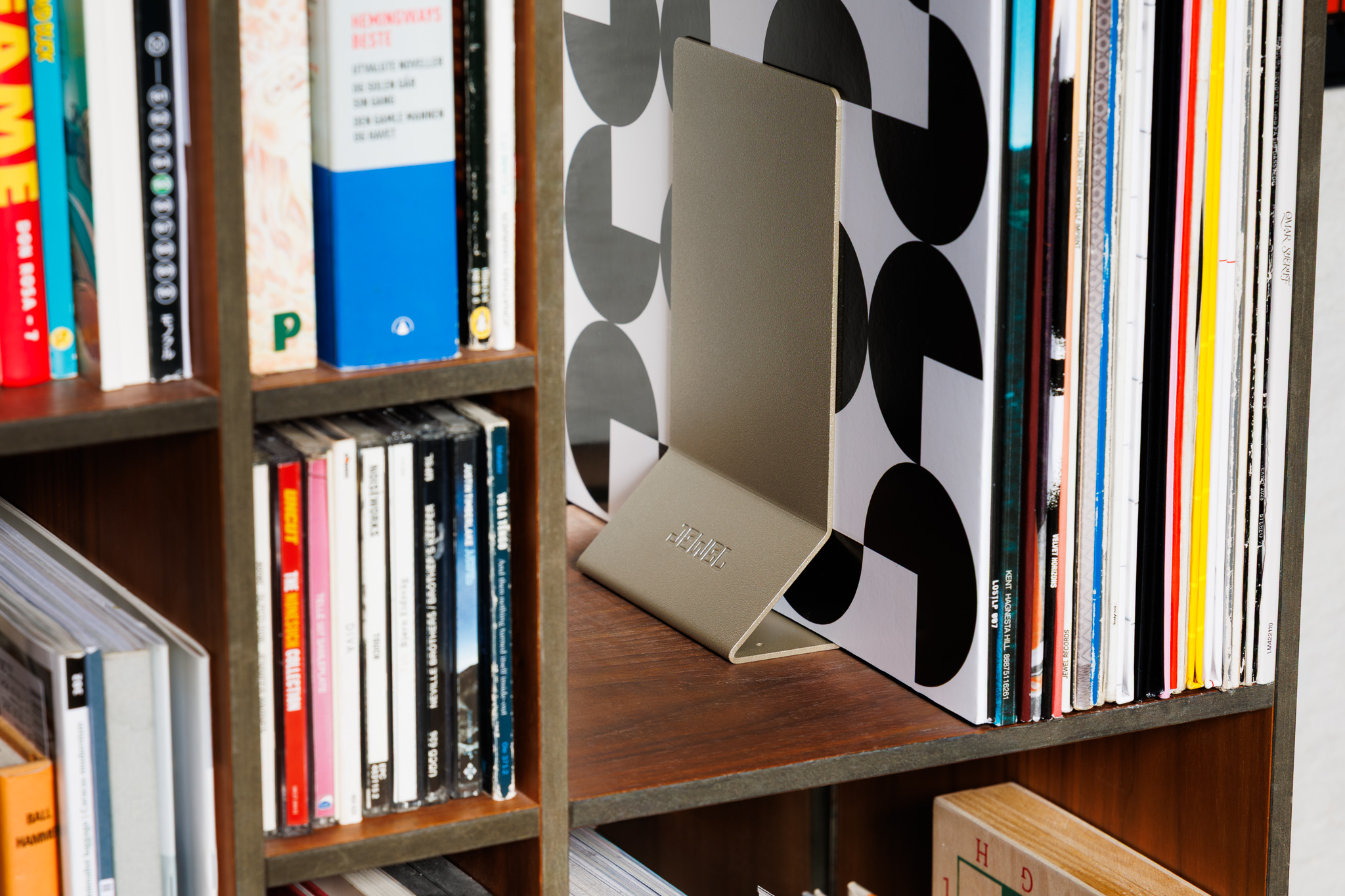 Der findes også LP-stativer, der holder flere LP’er på plads på en bogreol, og LP-serien fås i sort eller champagnefarvet aluminium.