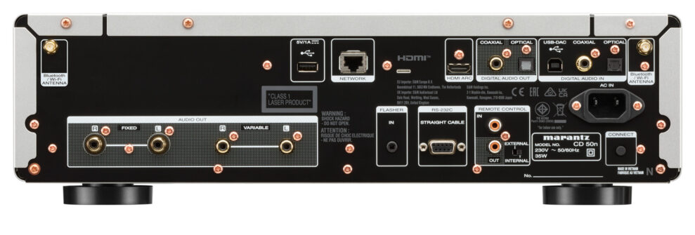 Marantz CD 50n er faktisk udstyret med HDMI ARC til tilslutning og styring af TV-lyd, samtidig med at den har netværkstilslutning, både via Ethernet og trådløst. Der er også digitale indgange til andre lydkilder, og den indbyggede ESS Sabre digitalkonverter understøtter op til 32 bit og 384 kHz PCM via USB og DSD 256.