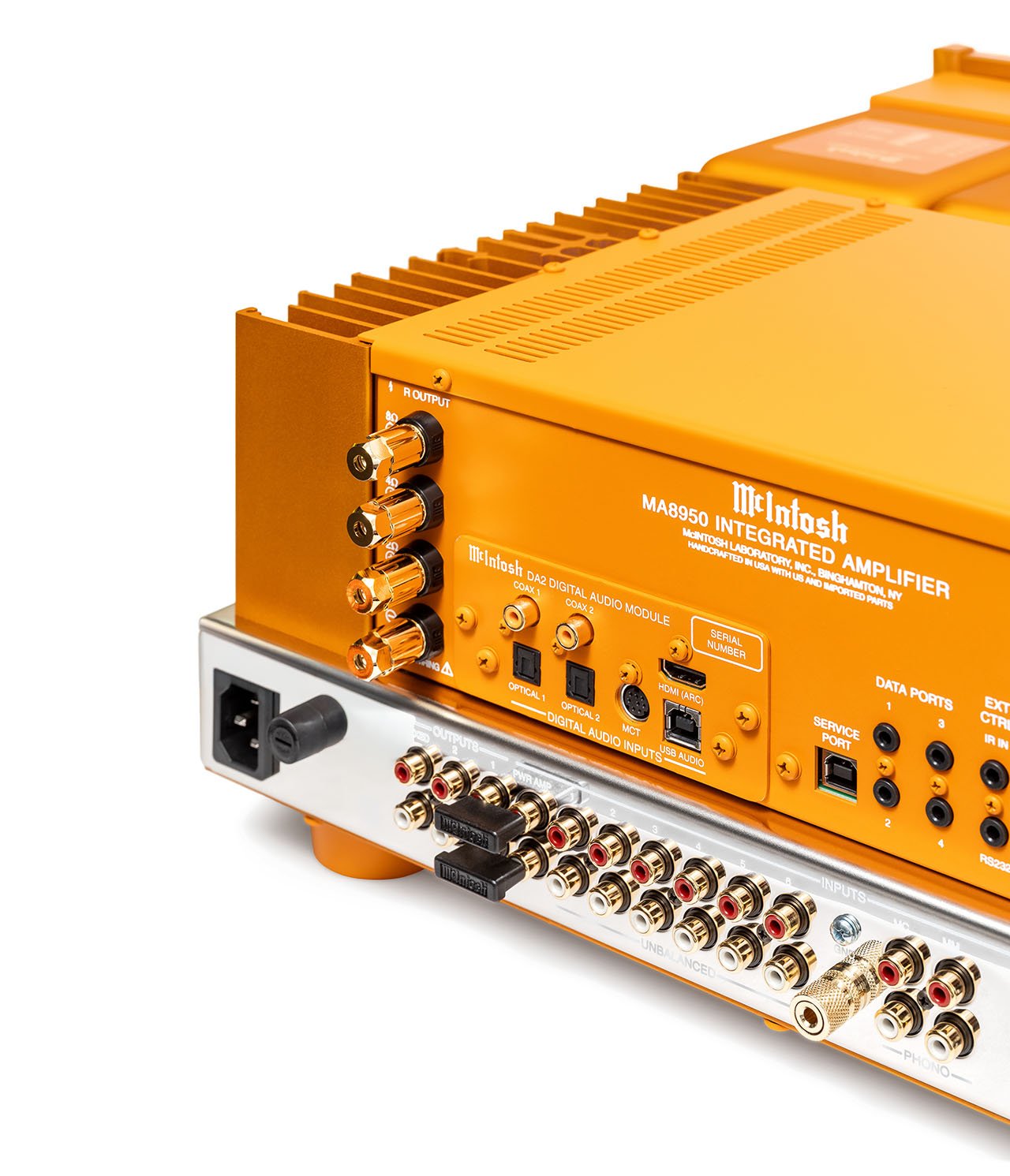 Først på markedet er MA8950 Integrated Amplifier Concept i Virgil Ablohs orange signaturfarve. Og forstærkeren er lakeret fra for til bag hos McIntosh, helt ned til monteringspladen til DA2 DAC-modulet på bagsiden.