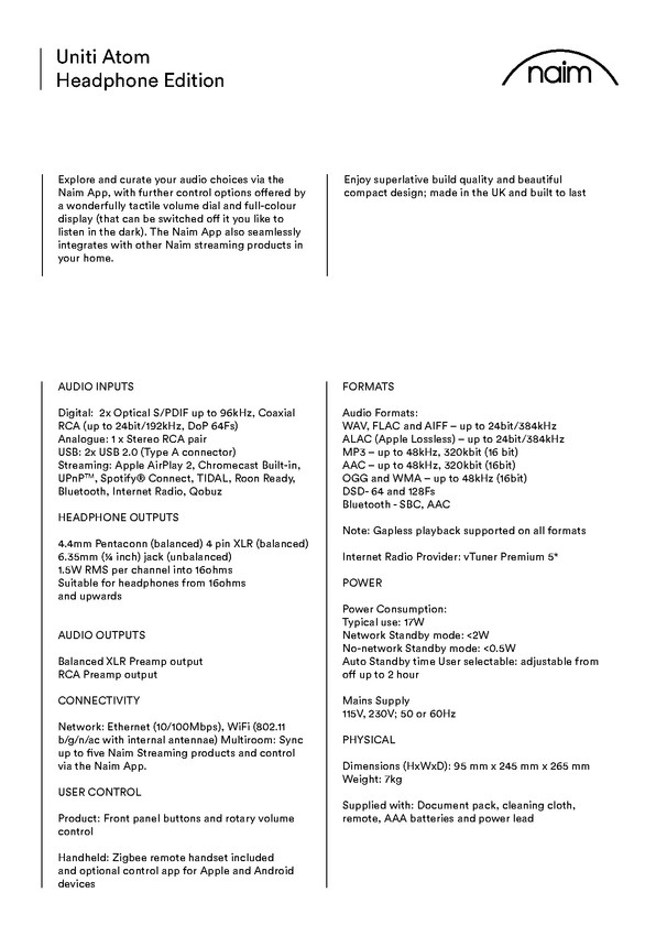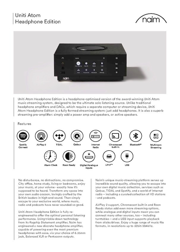 Mens den originale Uniti Atom er lavet til at drive højttalere, er Headphone Edition (som navnet antyder) en ren hovedtelefonforstærker. Og Naim ser heller ikke ud til at have sparet på godterne denne gang: Headphone Edition bruger angiveligt teknologi fra de prestigefyldte Statement-forstærkere i strømforsyningen og skal ifølge producenten selv kunne drive stort set alle hovedtelefoner – inklusive de kræsne Focal Utopia – uden problemer.
