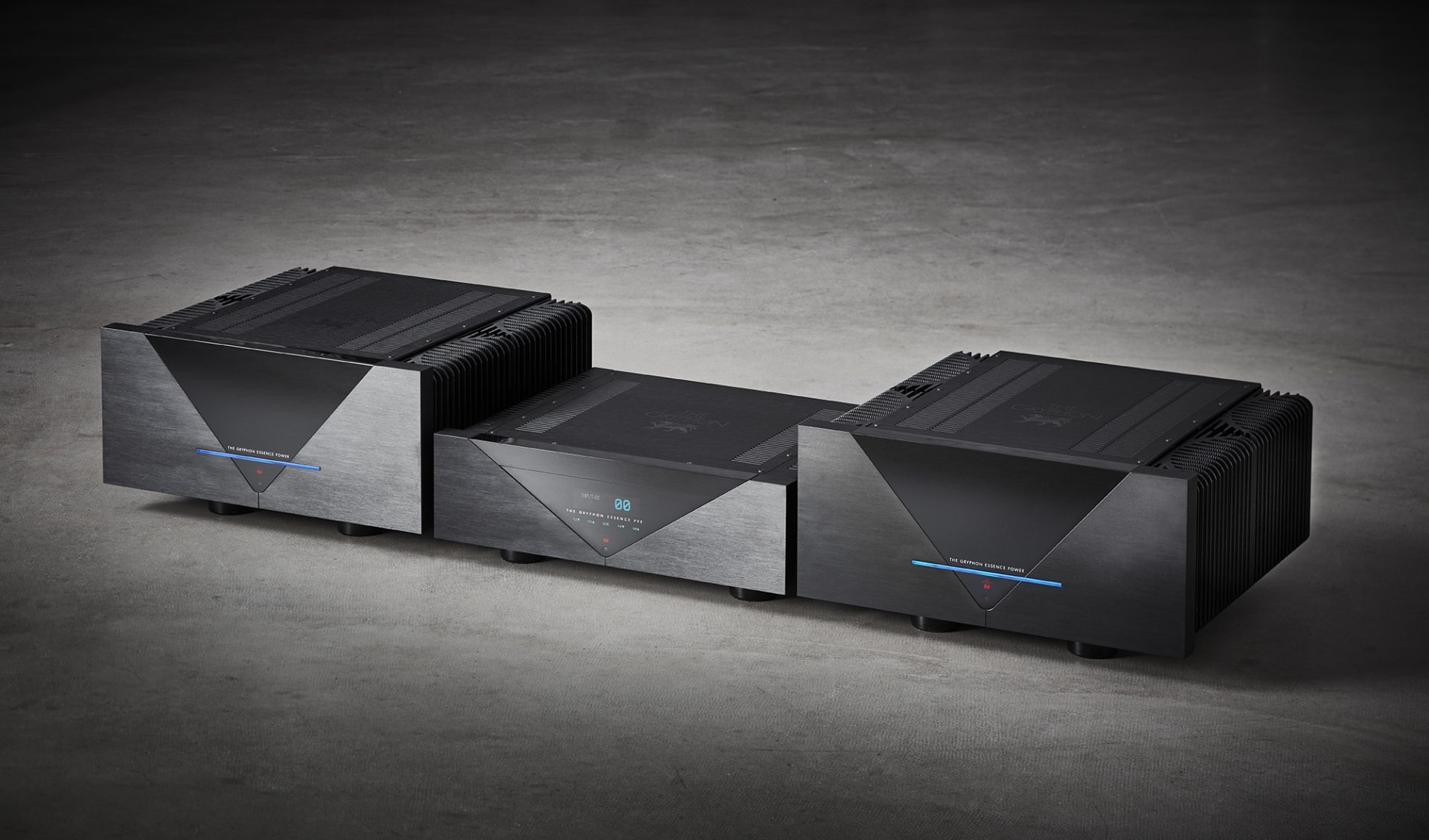Den nye Essence-serie kommer ikke i salg før begyndelsen af 2020, så indtil videre må vi nøjes med at kigge. Men som kendere vil lægge mærke til, har Gryphon nedtonet det karakteristiske design på Essence-serien: Glatte, matte sortanodiserede overflader, ingen knapper eller potmetre, kun køleribber og et V-formet panel midt på fronterne.