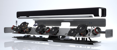 Playbar, som man har valgt at kalde den, er et ganske lille og temmelig fladt apparat. Der sidder ni højttalerelementer i tre grupper med to bas/mellemregister og en diskant. Alle højttalere mades af hver sin klasse-D forstærker og styres med DSP. Højttalerne sidder monteret i en vinkel på 45 grader. Det gør, at man kan sætte den i tre positioner – liggende, på væggen under tv´et og på væggen over tv´et. Et accelerometer registrer, hvor den sidder og tilpasser gengivelsen til det. Der findes ni EQ DSP-funktioner for hver placeringsindstilling, totalt altså 27 indstillinger. Interessant er, at i liggende stilling fungerer den faktisk sammen med et tv, som ikke er vægophængt, men som står på sin fod på et møbel.