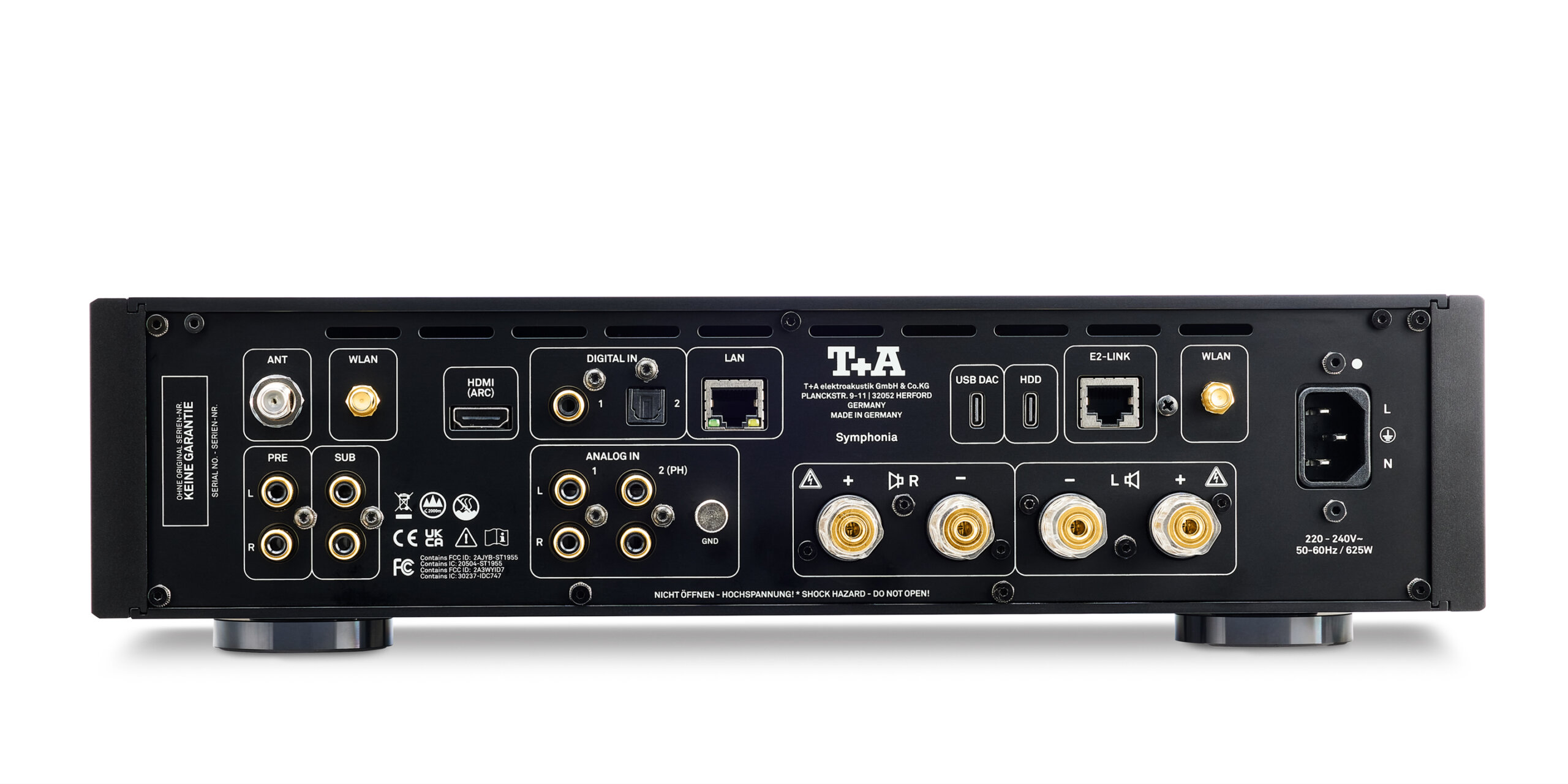 Symphonia er en fuldt integreret streamingforstærker, der kombinerer klassiske VU-metre med en LCD-skærm. Forstærkersektionen leverer respektable 250 W i 4 ohm fra udgangene på bagsiden.
