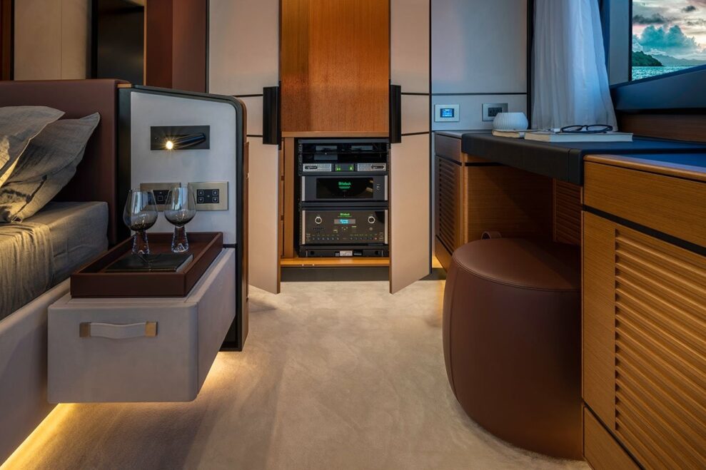 Også yachtens hovedkahyt, Master Cabin, er selvfølgelig veludstyret. Her finder man det samme ret heftige system som på øvre dæk.