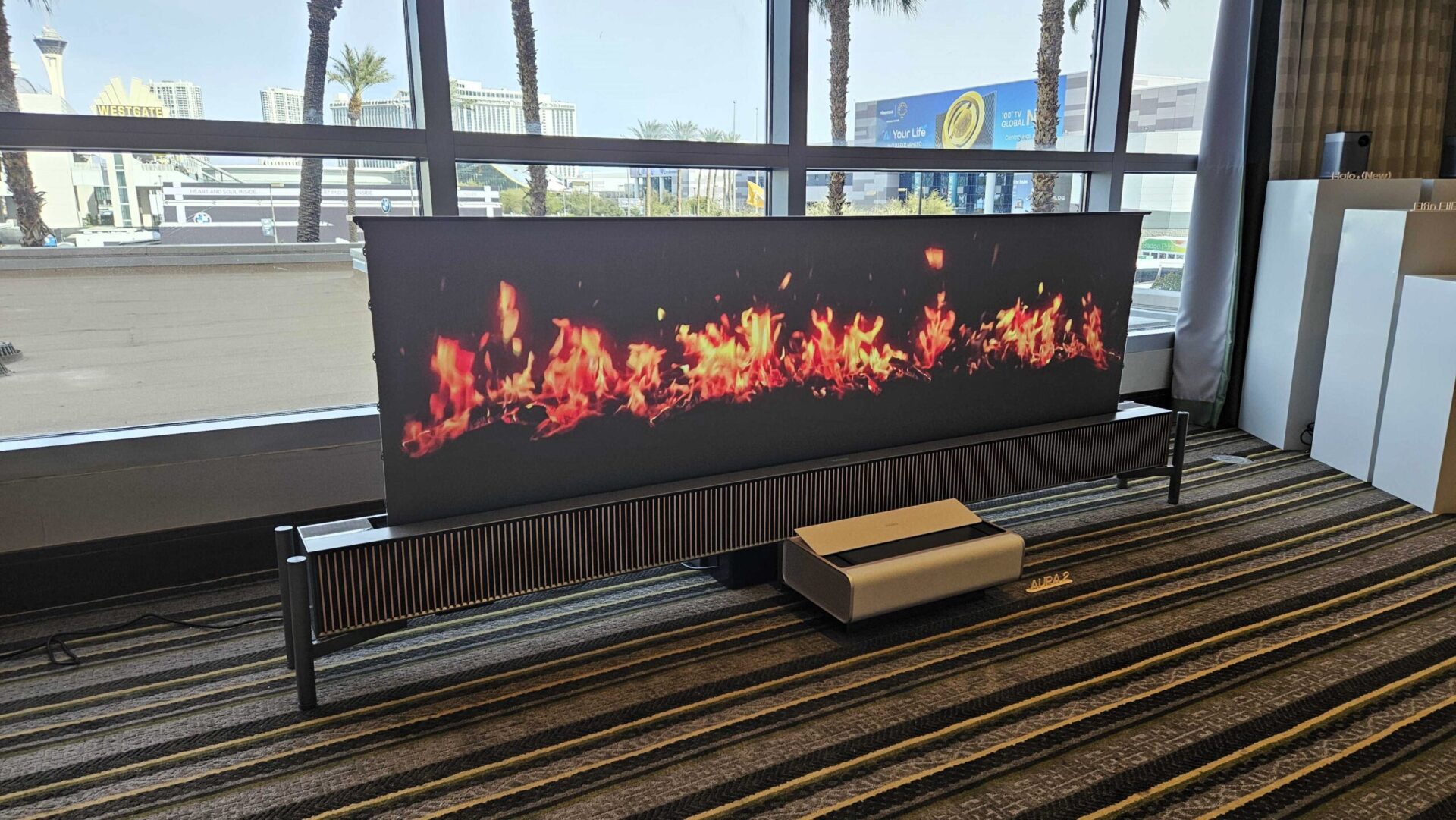 Lærredsmotoren kommunikerer med projektoren via Wi-Fi og kan også justeres til forskellige højder, så den f.eks. kan simulere en pejs med stemningsfulde flammer. Mekanismen virkede robust med stærke arme og ledninger, samtidig med at den var støjsvag.