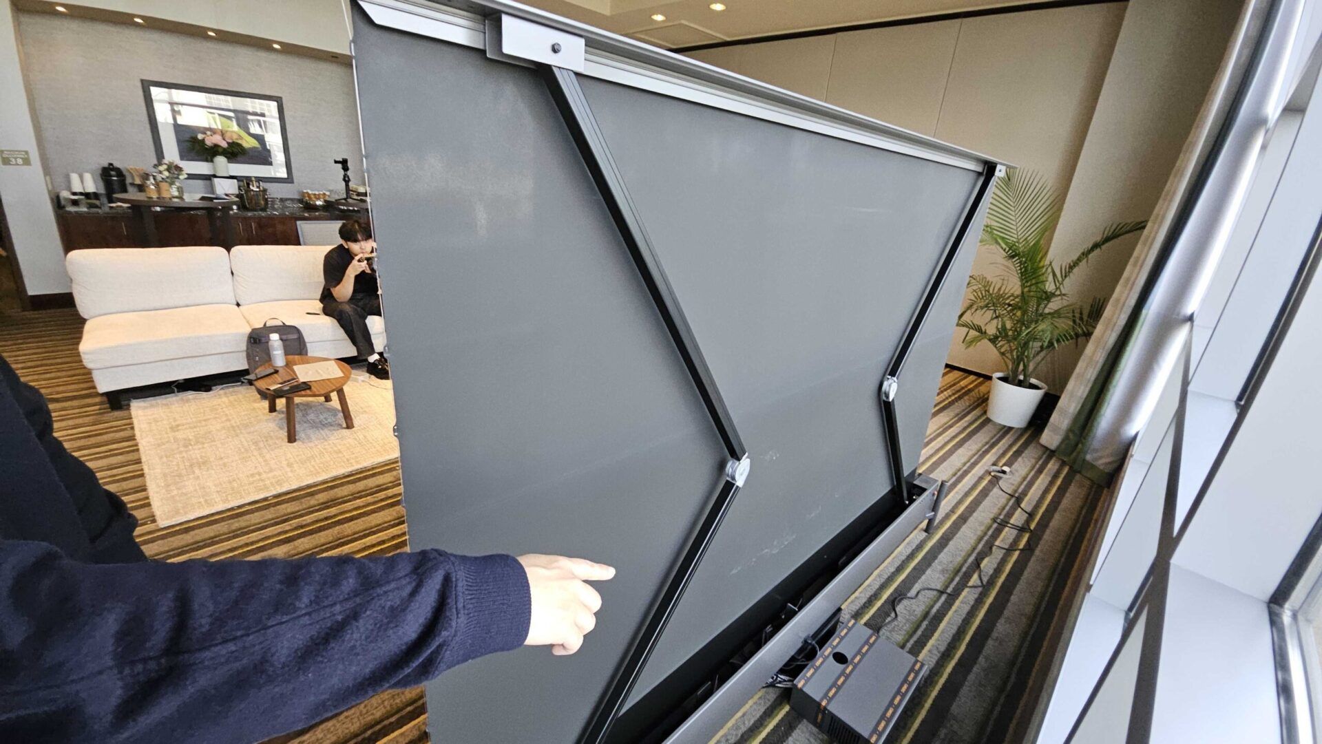 Det anvendte lærred er 100 tommer stort og af typen ALR (Ambient Light Rejecting), som giver den bedst mulige refleksion af projektorlyset, samtidig med at det reducerer det omgivende lys og sikrer optimal kontrast. XGIMI havde sat lærredet op i et relativt lyst hotelværelse, men det fungerede overraskende godt – og selvfølgelig endnu bedre, når gardinerne var trukket for.