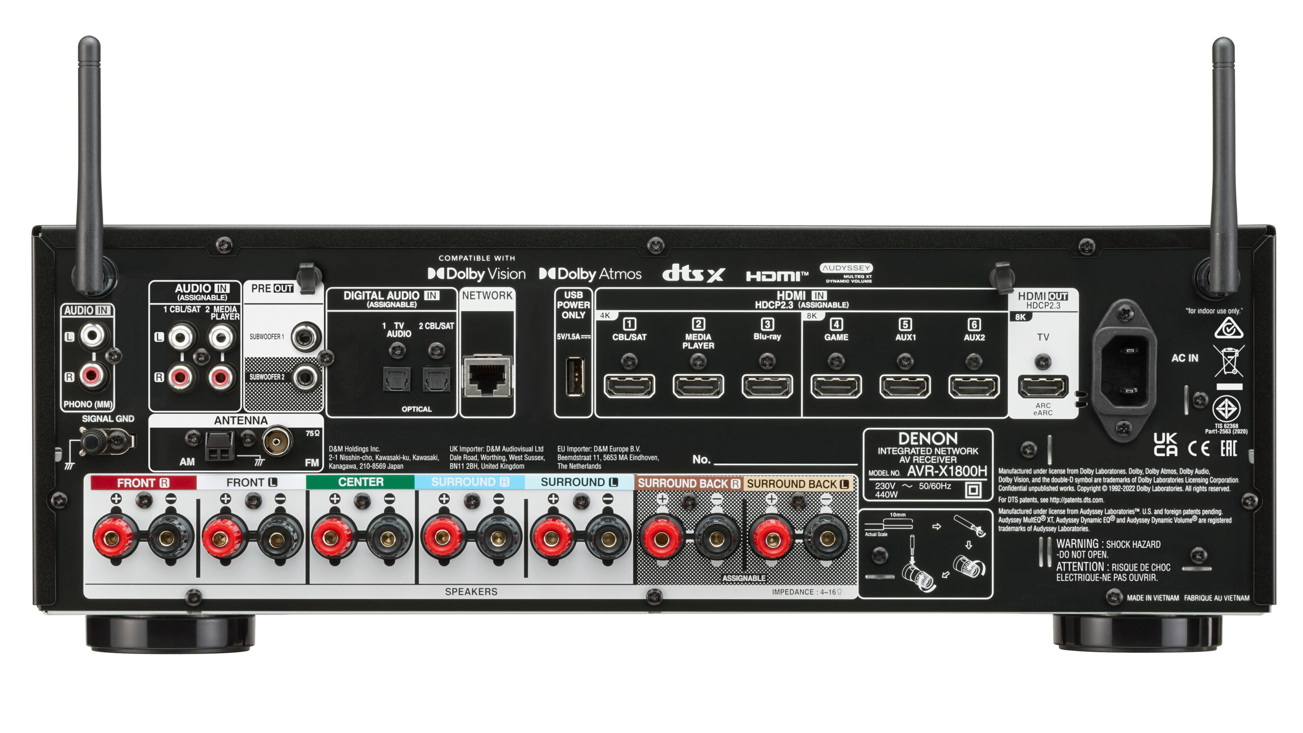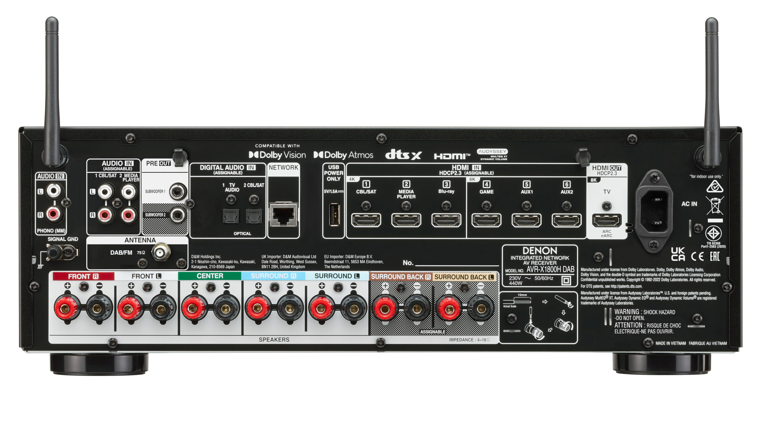 Denon AVR-X1800H er en 7-kanals receiver, som leverer 3D-lyd med Dolby Atmos og DTS:X. Derefter med en 5.1-opsætning plus to højttalerkanaler, der gengiver lyd ovenfra. Uanset om du fysisk monterer et par højttalere i loftet eller bruger den mere diskrete variant med Atmos Elevation-højttalere oven på fronterne. Disse vil så spille lyden op i loftet og derefter reflektere den ned til lytteren igen.