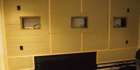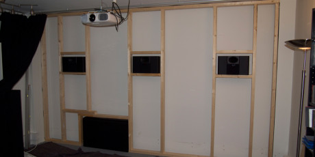 Der trækkes profilerede rør til højttalerkabler, strøm og signal til subwooferen. Indersiden af væggen isoleres og dæmpes med Rockwool eller lignende. Uden på ramme-elementet monteres der så mindst to lag gips og et lag spånplade, allerhelst MDF. Det er vigtigt, at rammen og væggen er solidt bygget for at undgå vibrationer.