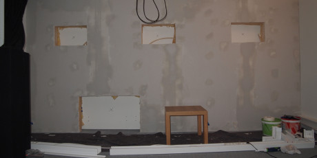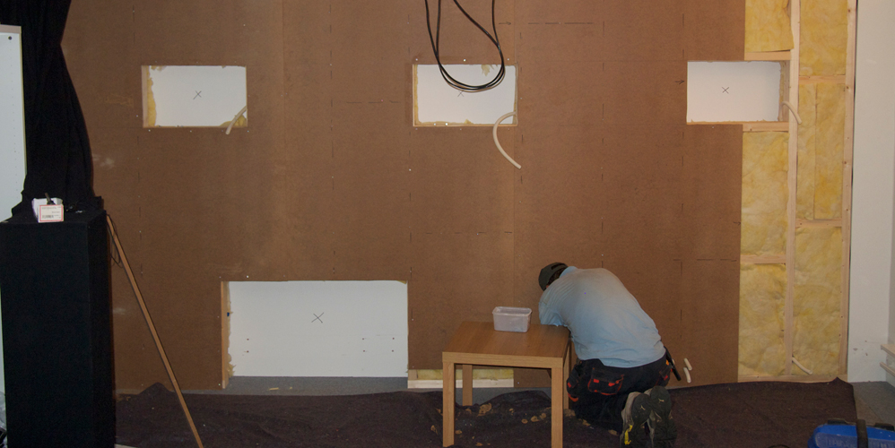 Derefter skal hele væggen dækkes med akustisk dæmpende materiale, igen med udskæring til højttalerne. I vores tilfælde brugte vi Paroc akustikplader af 50 mm stenuld, som kan bestilles hos dit lokale byggemarked. For at få en flot finish dækkede vi så væggen med scenemolton, et brandsikkert sort filtstof, som vi hæftede fast til stiverne.