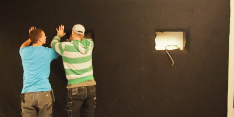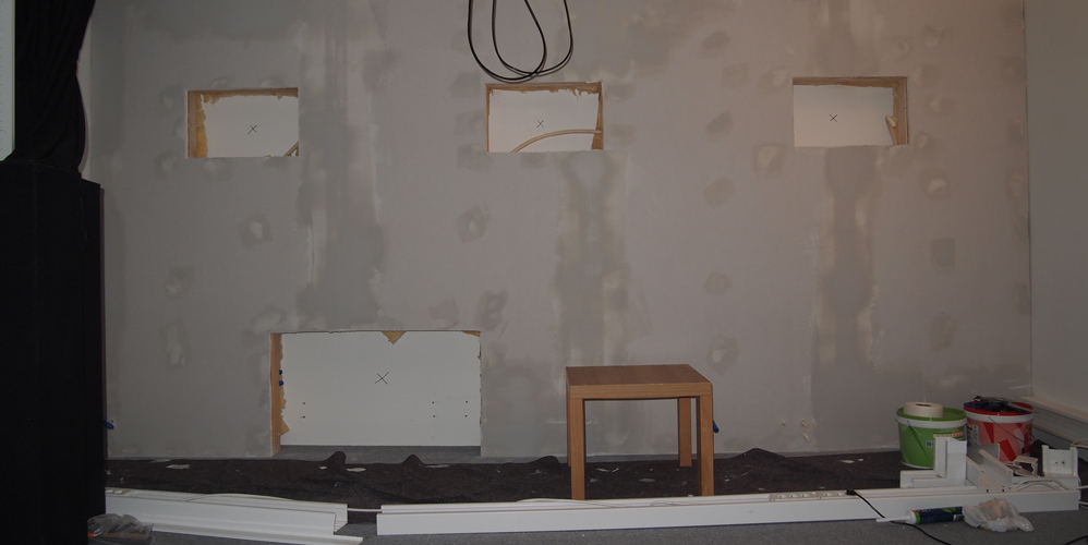 For at få det maksimale udbytte af Procella-højttalerne blev vi anbefalet at installere front- og centerhøjttalerne i en såkaldt baffelvæg, dvs. en ny, heldækkende væg med udskæring til højttalere og subwoofere.