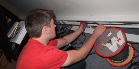 I en optimal hjemmebiograf vil man gerne holde elektronikken separat, enten på en reol eller i et separat teknikrum, med ledningerne trukket skjult i væggen. Fordelen er en pæn installation – ulempen er, at der bliver rigtig meget højttalerkabel. I vores tilfælde endte det med i alt 70 (!) meter højttalerkabel af god kvalitet.