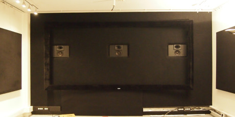 Et af målene med vores nye biografrum var at få en velordnet opsætning. Da der støt vandrer meget forskelligt udstyr ind og ud ad døren til testrummet, ville det være en stor fordel at få det permanente udstyr lidt af vejen. Det indebar vægmonterede højttalere, og desuden ville vi gerne have et endnu større billede. Valget var let: Det skulle være en skjult højttalerløsning bag et perforeret lærred, ligesom i biografen!