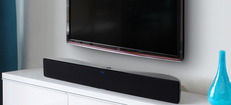 Den er 101 cm bred og har alt, hvad man har brug for indbygget. Koblet sammen med kabel-tv-modtageren, tv´et og en Blu-ray afspiller, har man en praktisk højttalerløsning. Som løser mange problemer. Og giver dig både stereolyd og surround.