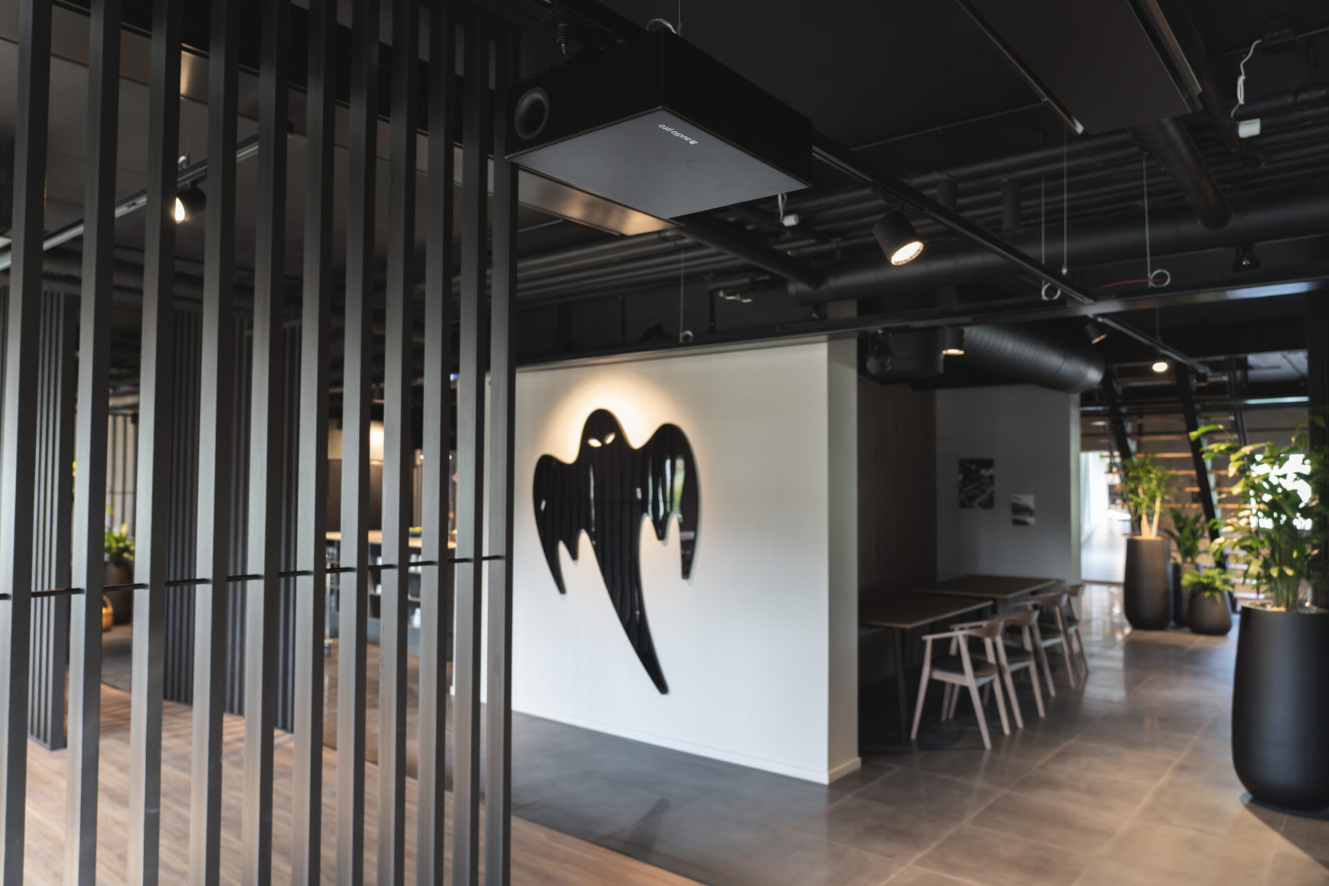 Højttalerne som er installeret hos Koenigsegg kommer fra Audio Pros Business-serie, inklusive SP-3 højttalere og SUB-3 subwooferen. Disse kan monteres via el-skinner i loftet sammen med den sædvanlige kontorbelysning – hvilket forenkler opsætningen af højttalere rundt om i lokalet. Strømmen tages herefter direkte fra de elektriske skinner, mens lyden afspilles via Audio Pros eget Wi-Fi/Multirum system.