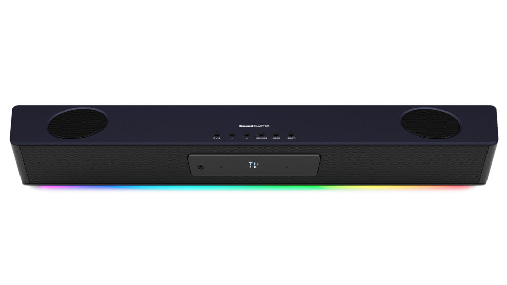 Den lille soundbar har fire drivere – to fremadvendte 54 mm-diskanthøjttalere og to opdadvendte 3″ bas/mellemtoneenheder – hver med sin forstærkerkanal (totaleffekt: 90 W RMS) og Creatives egen Super X-Fi DSP, der i følge producentens pressemeddelelse skulle levere “en rig og kraftfuld lyd uden at behøve en subwoofer.“