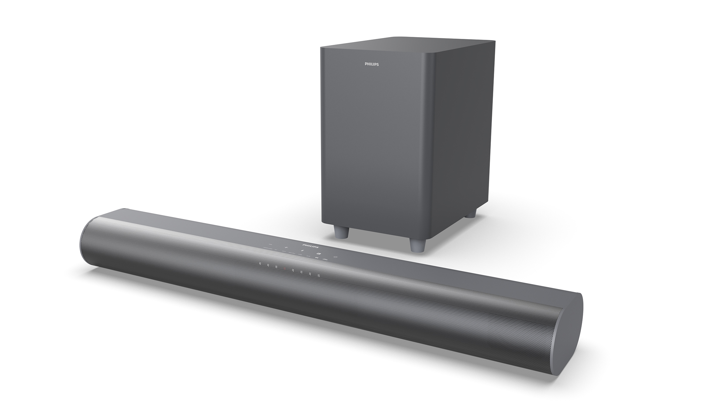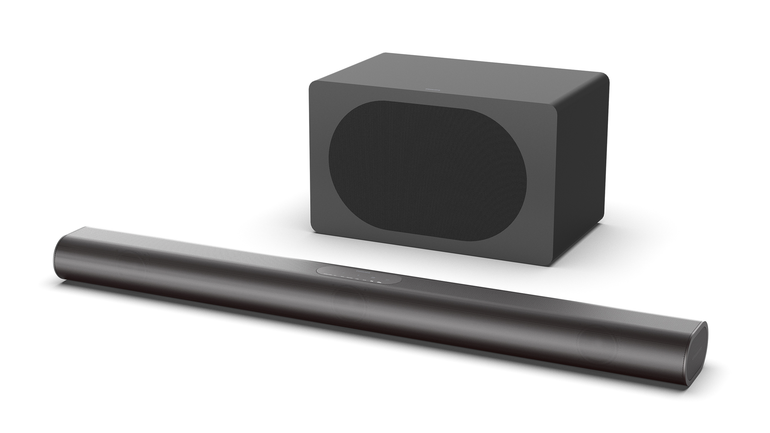 De beskedne dimensioner betyder, at Philips ikke har fundet plads til en separat centerhøjttaler, da dette er en simpel 2.1-løsning. Til gengæld er det lykkedes at klemme både en diskant og en oval basenhed ind i hver kanal. Ifølge Philips vil systemet levere 160 watt i alt, fordelt på 60 watt i soundbaren og 100 watt i subwooferen. Bemærk, at dette er angivet med hele 10 procent forvrængning, hvilket betyder, at soundbaren presses ud over et behageligt lydniveau.