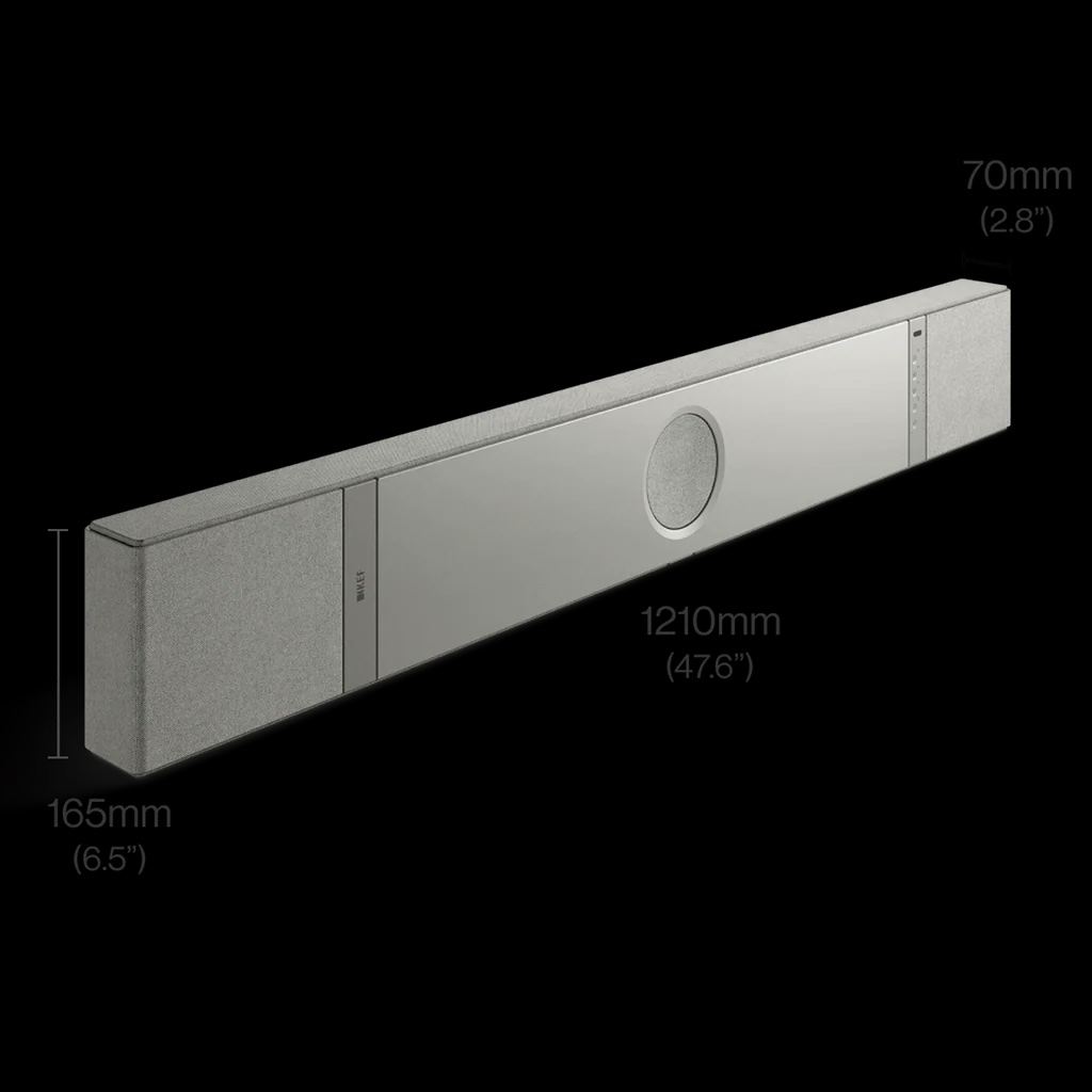 Kabinettet fås i sort eller lysegrå finish med en top i børstet aluminium og kan monteres på væggen eller placeres på en bænk foran TV’et. Soundbaren har også indbygget Intelligent Placement Technology. Den tilpasser lyden til soundbarens position i rummet.