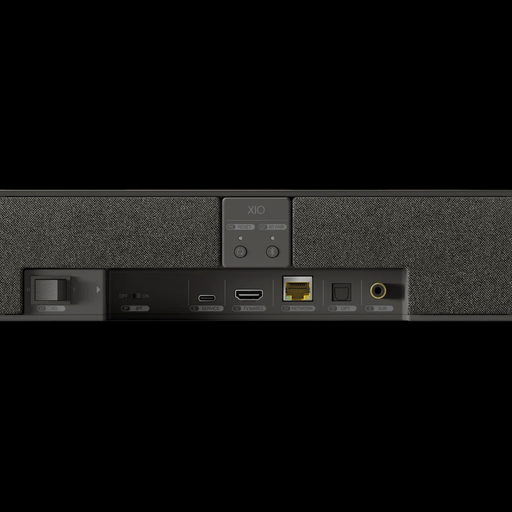 XIO har Dolby Atmos integreret og understøtter også Sony 360 Reality Audio og DTS:X. Højttalerenhederne er konfigureret i 5.1.2, fem af dem er fuldtone-enheder, en vender fremad, derudover er der to bas-enheder, og to af dem er højdekanaler til surround.