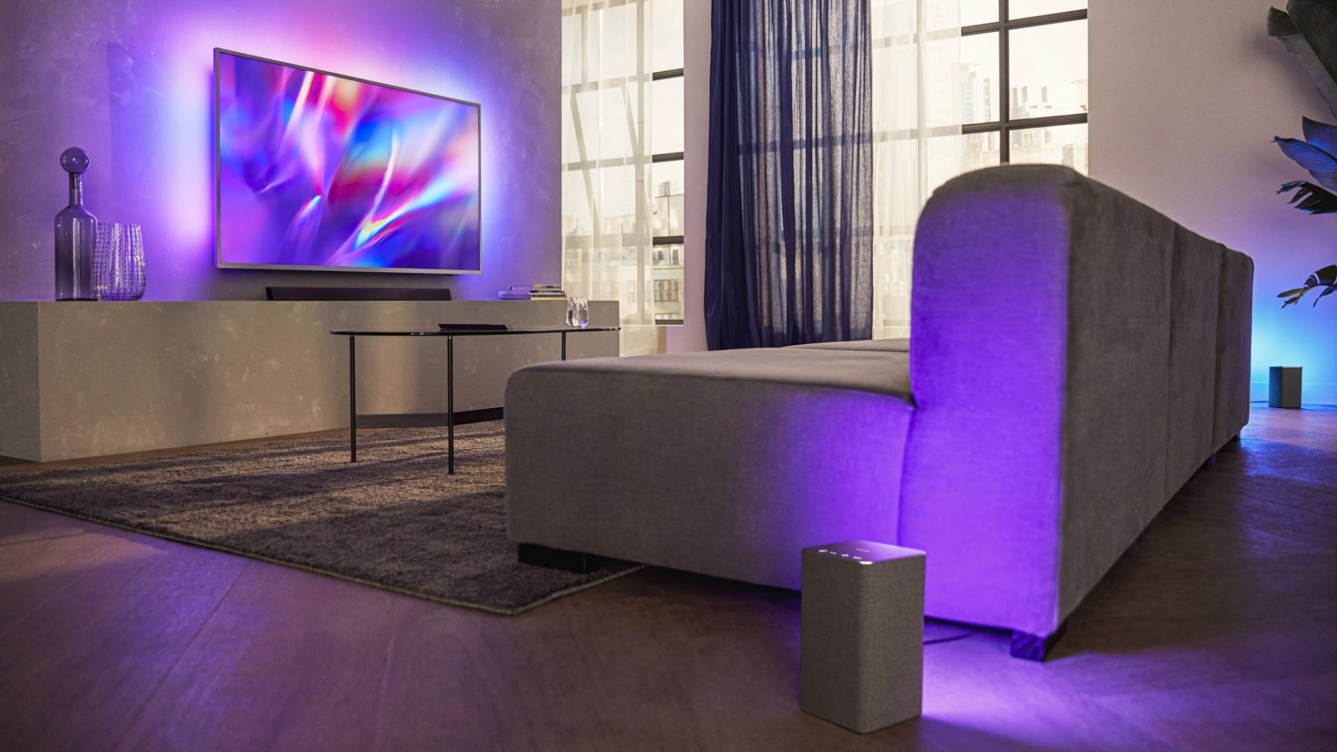 TV & Sound Wireless Home System er navnet på en familie af Philips-produkter, der omfatter både TV’er, soundbars og trådløse højttalere, som synkroniserer lyd og billede – og byder på et LED-lysshow i RGB-farver.