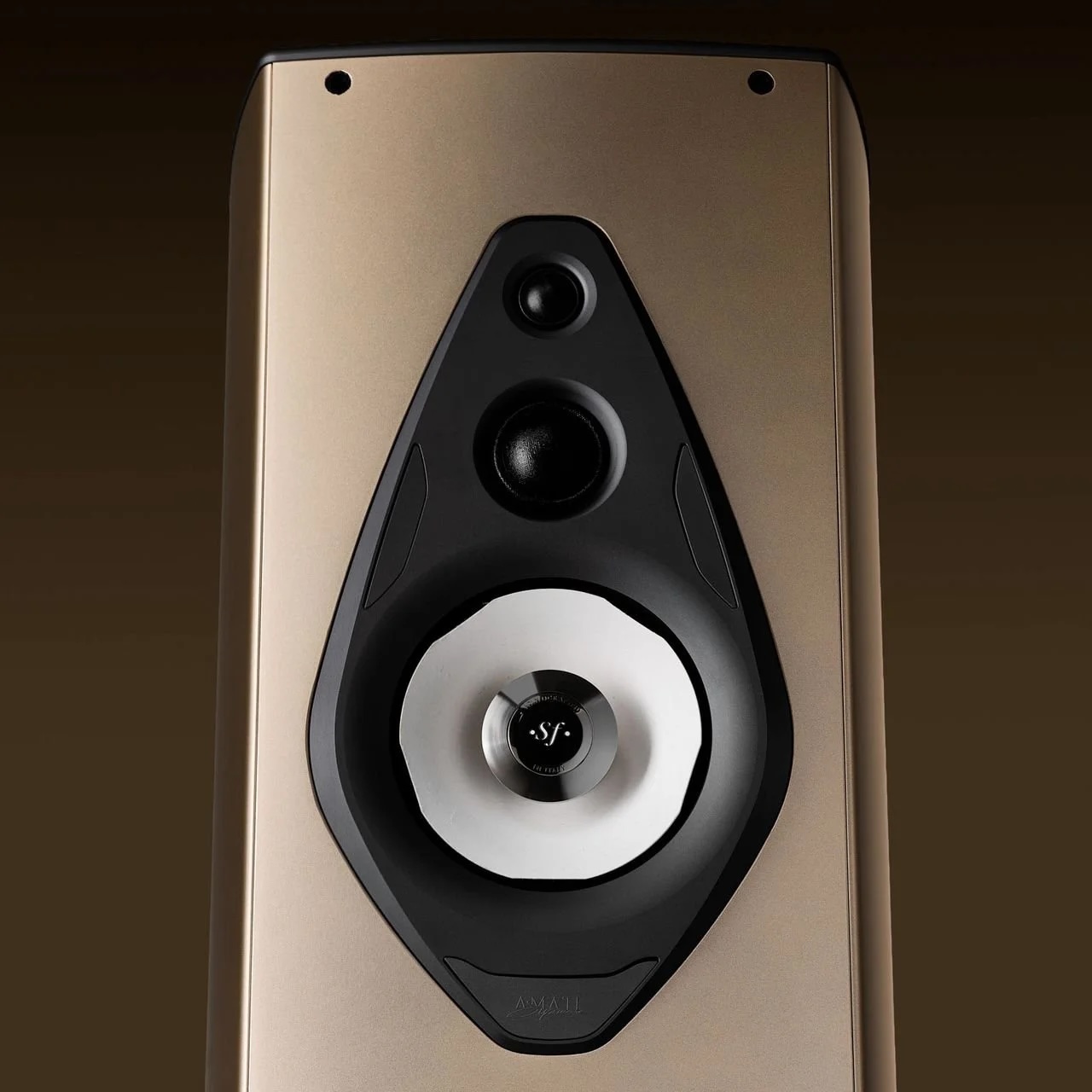 Sonus fabers 165 mm Camelia-driver med den hvide membran tager sig af området fra 300 til 1.800 Hz. Derefter overdrages ansvaret til en 38 mm diskant, der runder af ved 5.600 Hz. Der tager en 20 mm superdiskant over indtil de angivne 40.000 Hz.