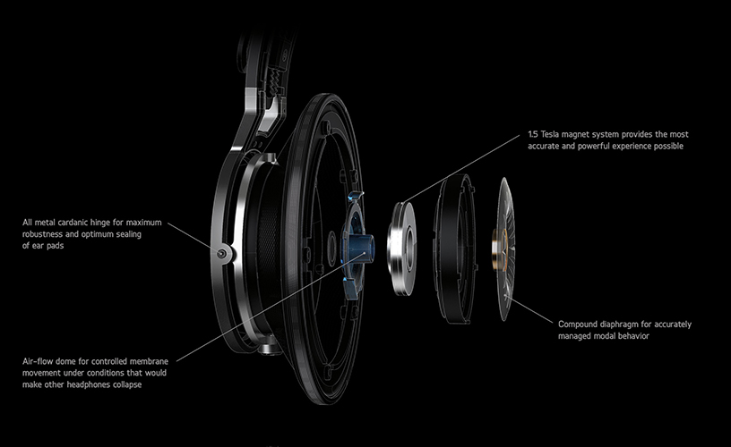 De er bygget i aluminium og er udstyret med en nyudviklet 53 mm stor membran, og indvendig ser den således ud, når alle vigtige dele er separeret fra hinanden: