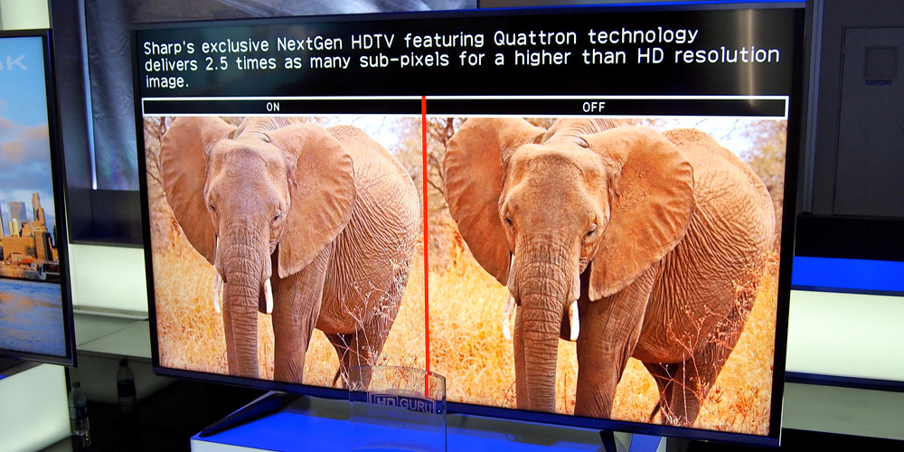 Sharps nye topserie af Full HD-fjernsyn er hverken Full HDTV eller 4K, men nærmere en slags hybrid! Den oprindelige Quattron-teknologi bestod af en fjerde, gul subpixel (en normal tv-pixel består af tre subpixels i rød, grøn og blå), som gav øget farvedybde og reduceret energiforbrug. Med Quattron+ er den japanske producent gået endnu længere: Her er subpixelene nemlig splittet i to dele, og ved hjælp af softwarestyring af disse har man kunnet udvikle et Full HD tv, som “simulerer” billedkvaliteten fra en 4K skærm. Ud fra det, vi fik forklaret, skal Quattron+ serien faktisk være i stand til at modtage 4K-billedsignaler, som den derefter nedskalerer til 1080p.