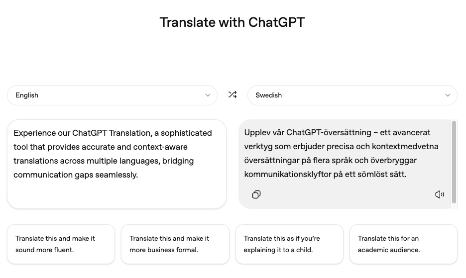 Men uanset om det er rigtigt oversat ord for ord, er det ikke altid man synes, at oversættelsen er brugbar. Den kan være meget formel – eller omvendt alt for dagligdags. Det interessante er, at man nu kan ændre tonen i oversættelsen. Nederst findes der knapper til at “gøre oversættelsen mere flydende”, gøre den “mere formel”, “Oversæt dette, som om du skal forklare det til et barn” samt “Oversæt dette til et akademisk publikum”. Med ét tryk bliver man sendt videre til almindelig ChatGPT, som laver tilpasningen for dig, og dér kan du fortsætte med at arbejde videre med teksten.