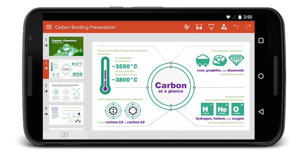 Blandt vigtige funktioner er muligheden for at redigere i dokumenter direkte fra mobilen – med samme redigeringsværktøjer, som man kender fra pc-versionen af Office – og så muligheden for at vise Powerpoint-præsentationer direkte fra sin smartphone. Man kan simpelthen vise sin præsentation trådløst fra mobilen til skærmen i møde- eller klasselokalet – og det endda med de samme slide-overgange og animationer, som hvis man havde brugt sin pc.