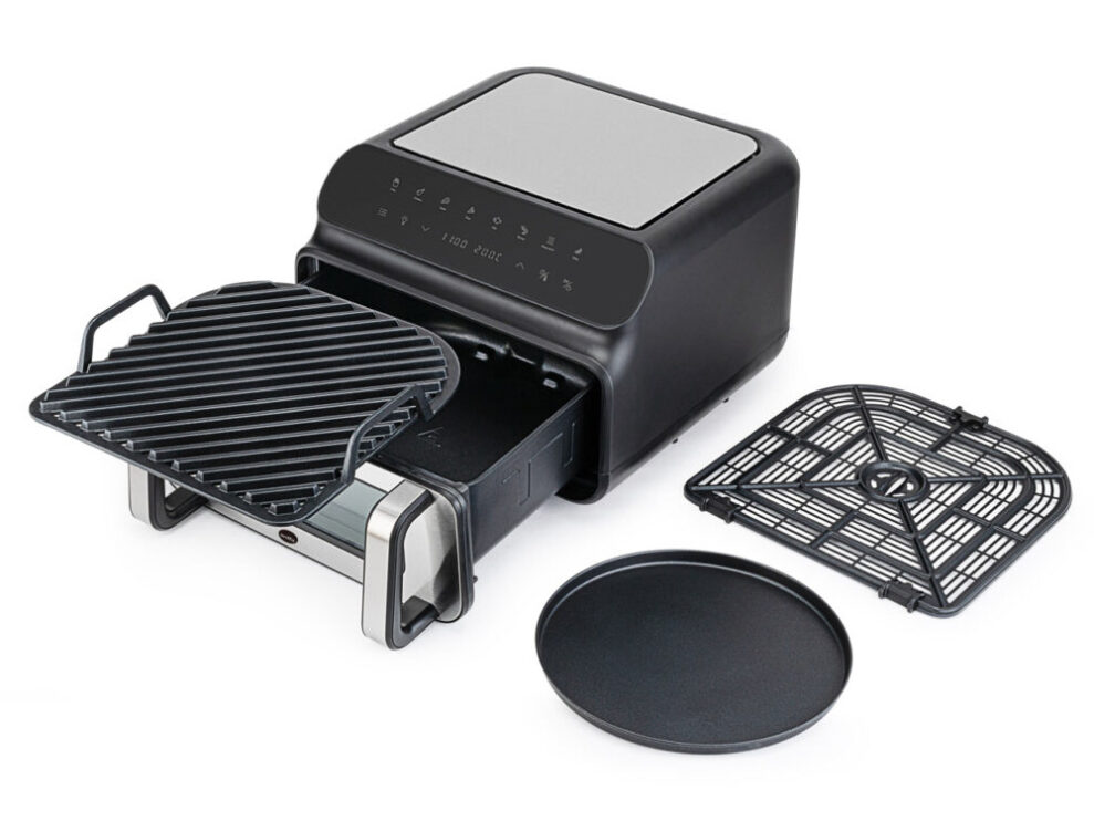 Airfryeren har en 10-liters kurv, grillfunktion med ekstra høj temperatur, temperaturindstillinger fra 30°C til 230°C og leveres med grillplade, kurv og pizzaform. Målene er 48,7 x 37,2 x 26 cm (BxDxH), og vægten er 8,3 kg.