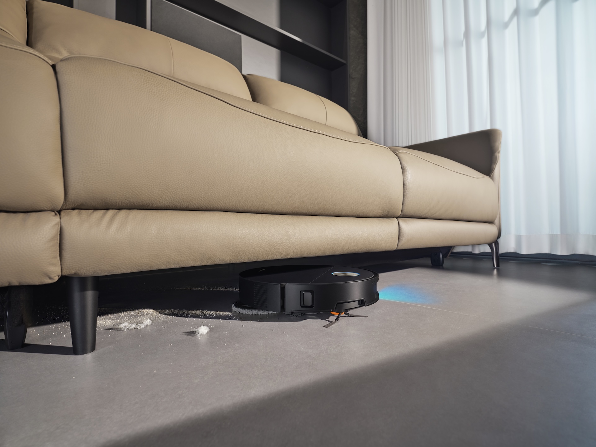 En ny flagskibsmodel blandt robotstøvsugerne, der er slankere end de fleste. En højde på kun 7,95 cm betyder, at den kan komme ind under lave møbler, hvor andre robotter ikke kan komme til.