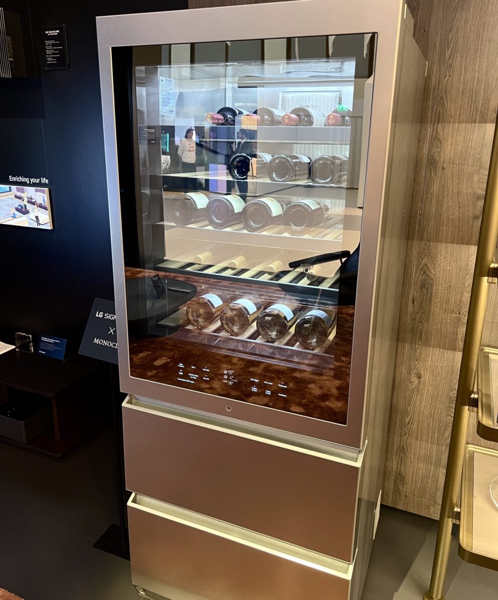 På pletten fandt man også det opdaterede Signature køle-fryseskab. Den har nu InstaView (så du kan se, hvad der er indeni uden at åbne døren) på begge døre. Automatisk døråbning, ismaskine og tilslutning til LG ThinQ UP app, naturligvis.