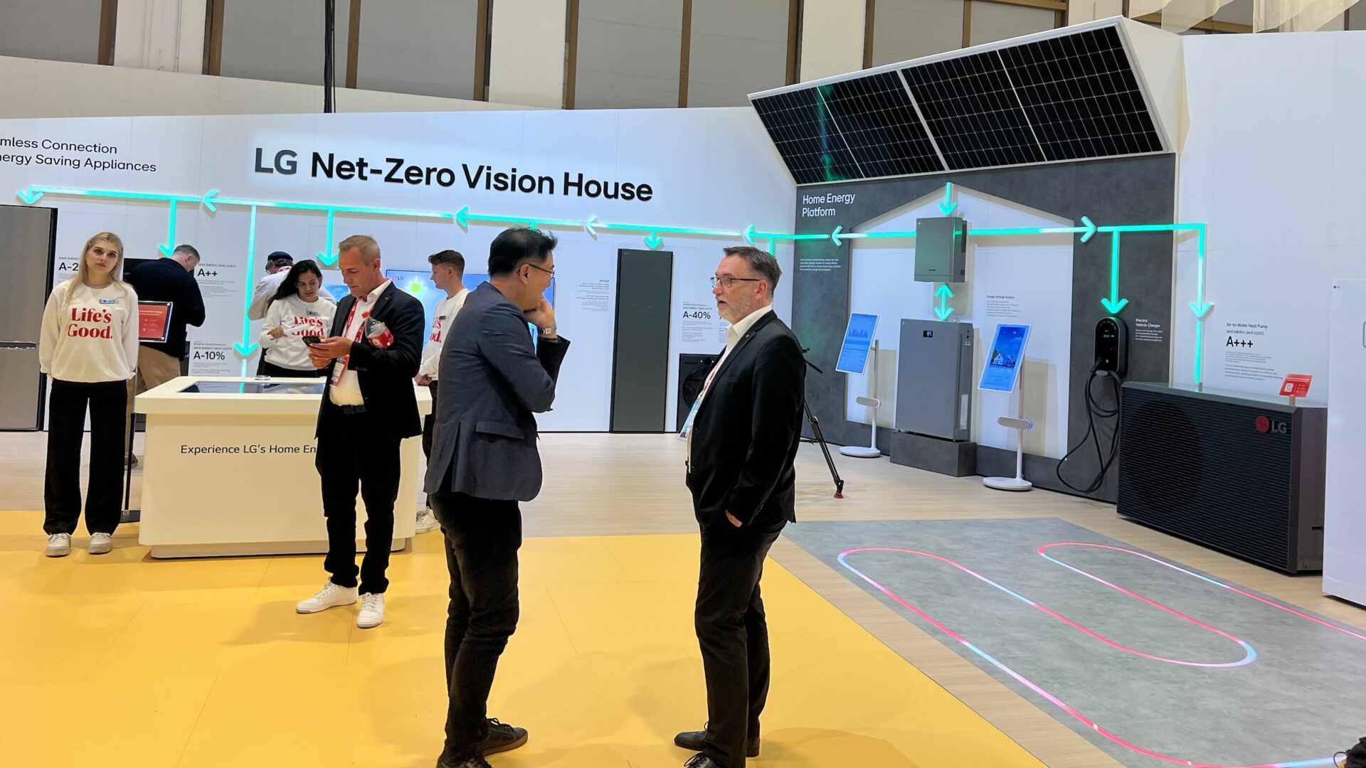 LG Electronics’ stand var et typisk eksempel på en stor trend på IFA-messen: energibesparelse og genbrug. Hvor de tidligere år havde hele vægge med kæmpe fjernsynsskærme, havde de i år blot to (!) fjernsyn; deres flagskibsmodel og det bærbare “kuffert-TV”. Den anden stand handlede om smarte enheder og den grønne omstilling.