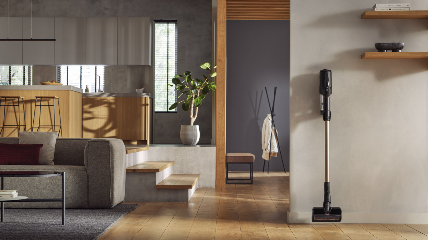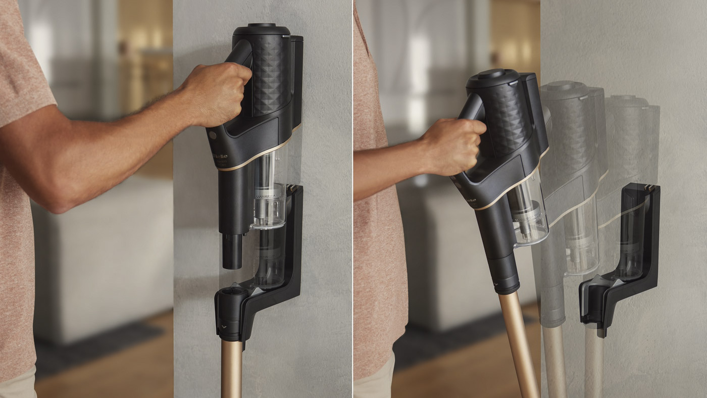 Mieles nye stangstøvsuger Duoflex HX1 kan i en håndevending forvandles fra en almindelig støvsuger til en håndholdt enhed ved at trykke låseringen ned, så PowerUnit (bestående af motor, opladeligt batteri og støvbeholder) frigøres fra røret.