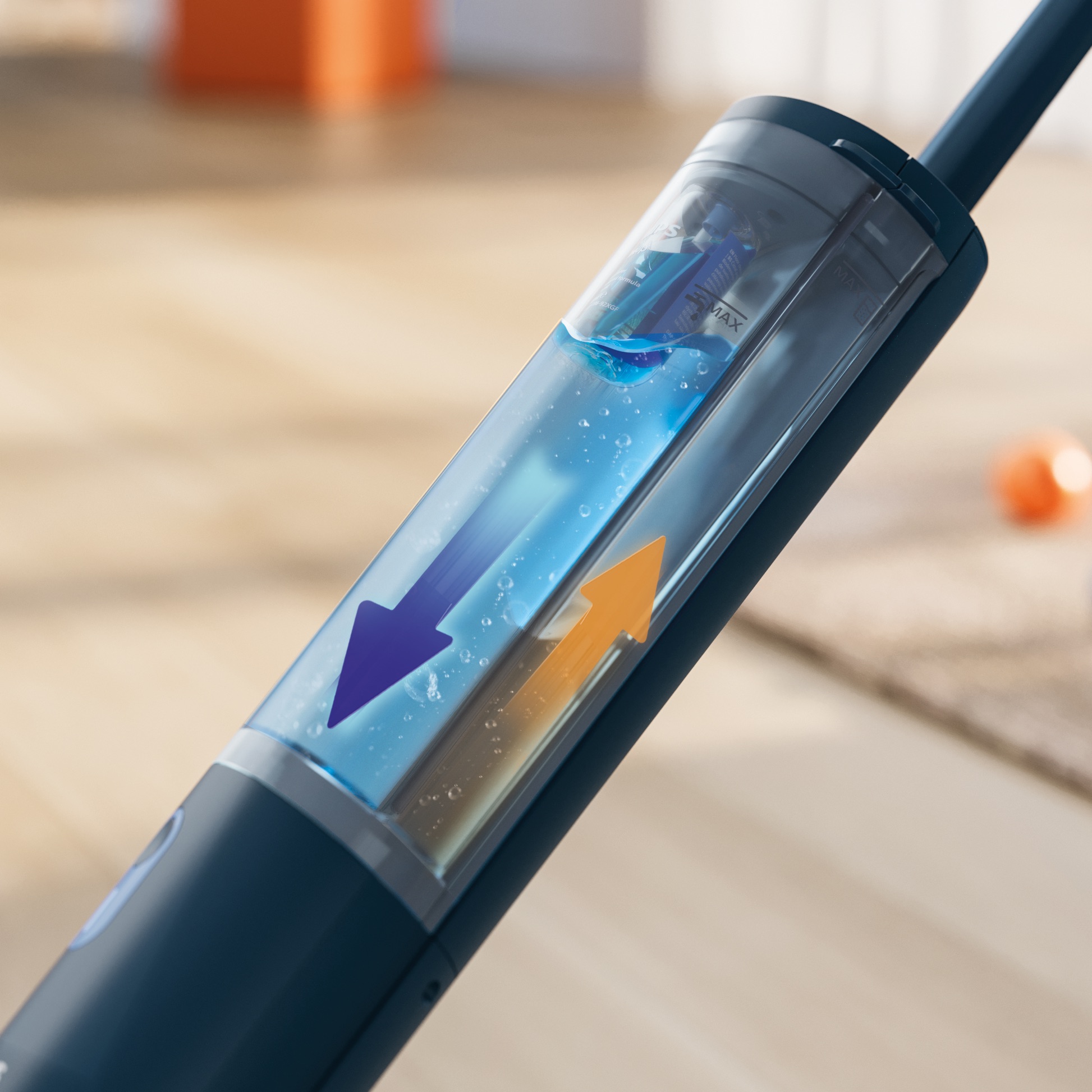 Den elektriske moppe har en tank med rent og en med snavset vand. Et pumpesystem suger det beskidte vand op, mens mikrofibermoppepuden genfugtes med rent vand. Den har indbygget automatisk dosering af rengøringsmiddel, som burde række til 40 rengøringer. Vandtanken rækker til at moppe 50 kvadratmeter gulv. Bagefter er det bare at smide moppepuden i vaskemaskinen.