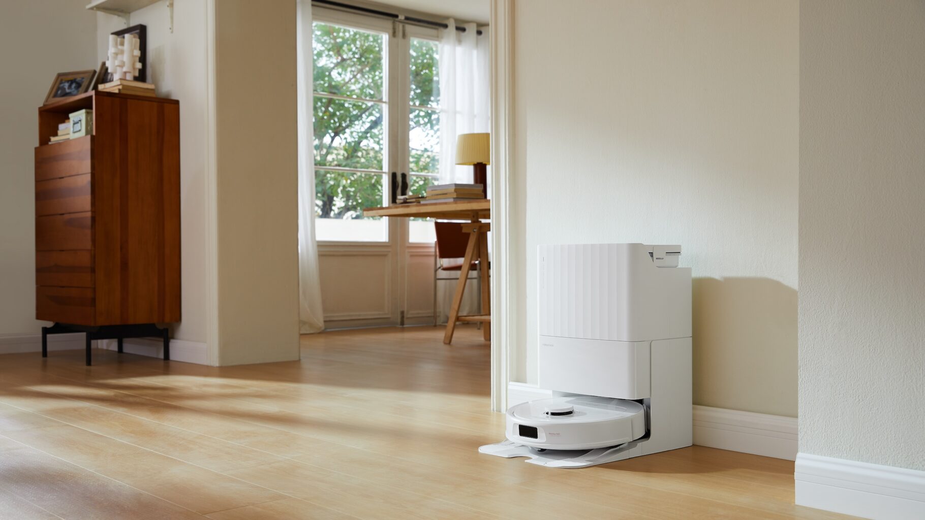 Dockingstationen tømmer støvet og filtrerer luften, så støvposen kun skal udskiftes hver syvende uge. En tank med rent vand er nok til at moppe op til 330 kvadratmeter. I stationen bliver moppen vasket, derefter skyllet og til sidst tørret ved at centrifugere mopperne.
