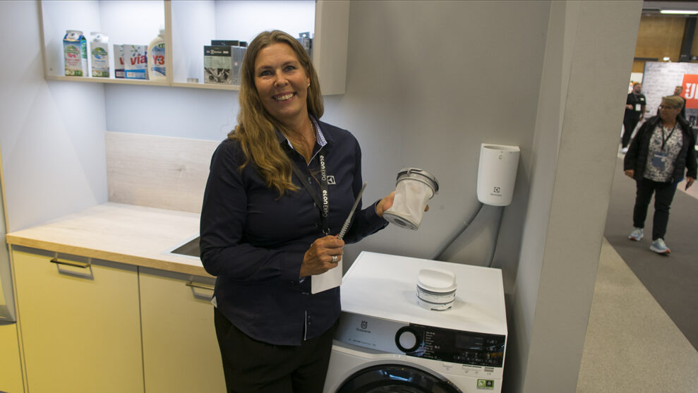 Et meget interessant produkt, der blev fremvist på Electrolux’ stand på Elon Expo i juni 2022, var E9WHMIC1 – et mikroplastfilter, der skal kunne tilsluttes stort set alle vaskemaskiner (Electrolux oplyser, at det kan bruges med alle Electrolux-, AEG- og Husqvarna-vaskemaskiner) for at reducere mængden af mikroplastfibre, der udledes med vaskemaskinens afløbsvand.