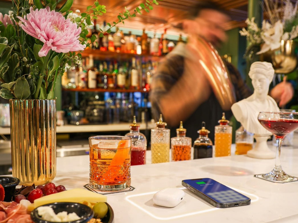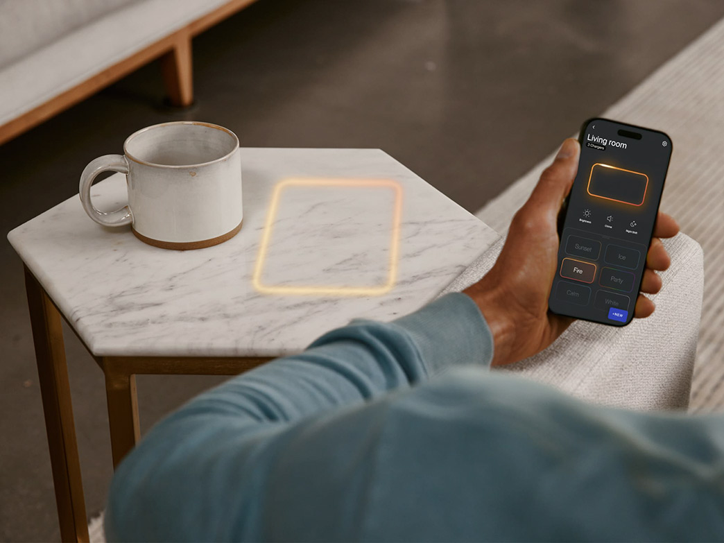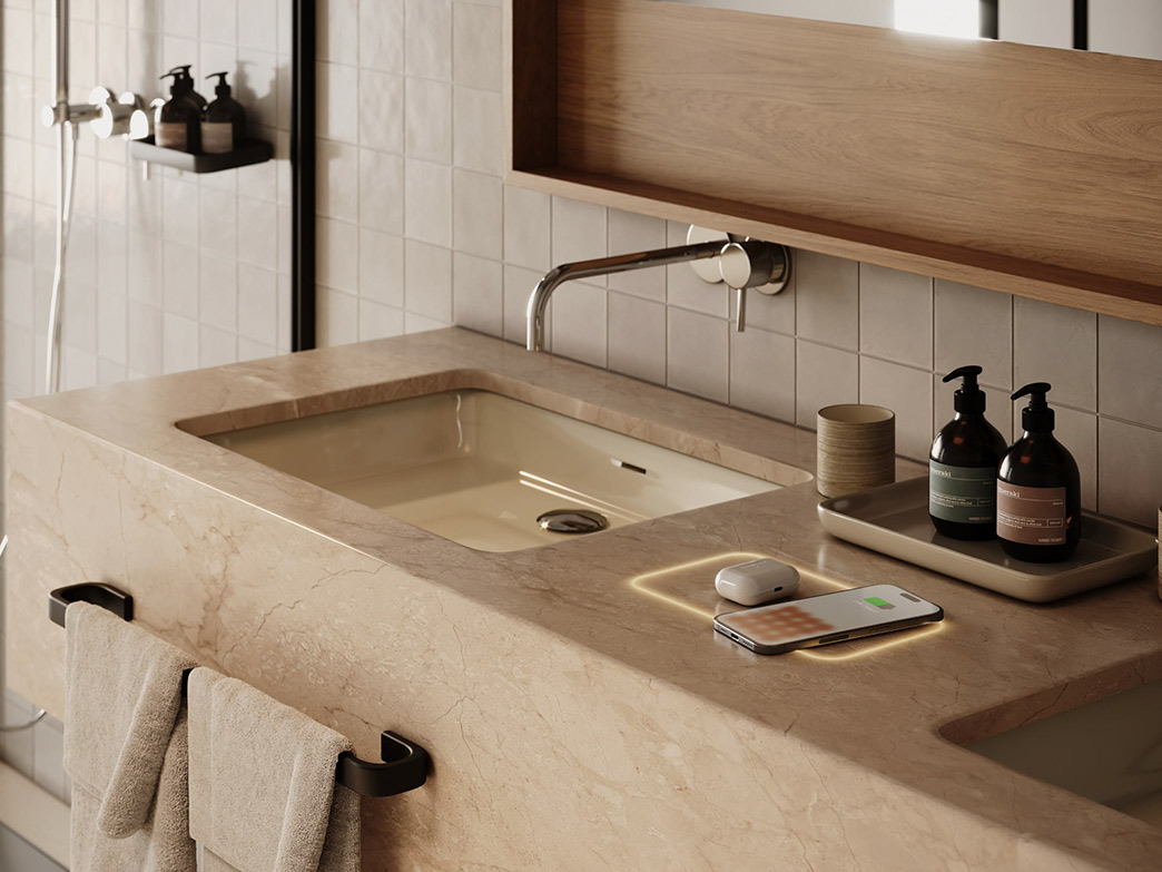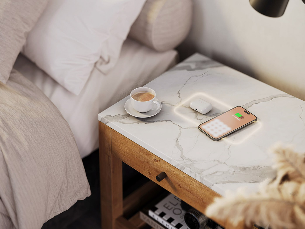 For at bevare en glat, elegant og uafbrudt bordplade er FreePower designet ind i selve stenen. Bortset fra den patenterede lyskrans er der ingen indikation af, at der ligger en trådløs oplader lige under overfladen. Kransen indikerer opladningszonen, som styres af en app, hvor brugerne kan tilpasse farverne, fra diskret hvid til flerfarvet “party mode”. Den kan slås helt fra og derefter genaktiveres med en funktion, der hedder “Wave to Wake”. Her skal man blot vifte en smartphone hen over området – så lyser opladningszonen op for at vise, hvor telefonen skal placeres.