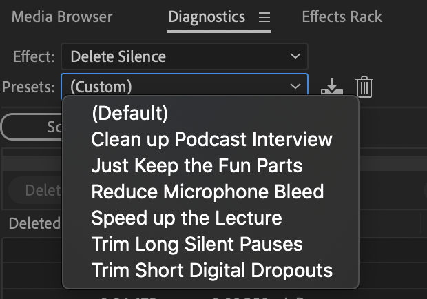 Normalt markerer man pauser manuelt og klipper selv i Diagnostics-panelet. Nu kan man endelig gøre det automatisk. Strip Silence-funktionen genkender automatisk stilhed under et bestemt lydniveau og fjerner al lyd. Men uden at gøre filen kortere, for man vil jo have samtalen i sync. Man kan justere indstillingerne i Clean Up Podcast Interview, hvor man f.eks. kan sætte tærsklen for, hvad der betragtes som støj.